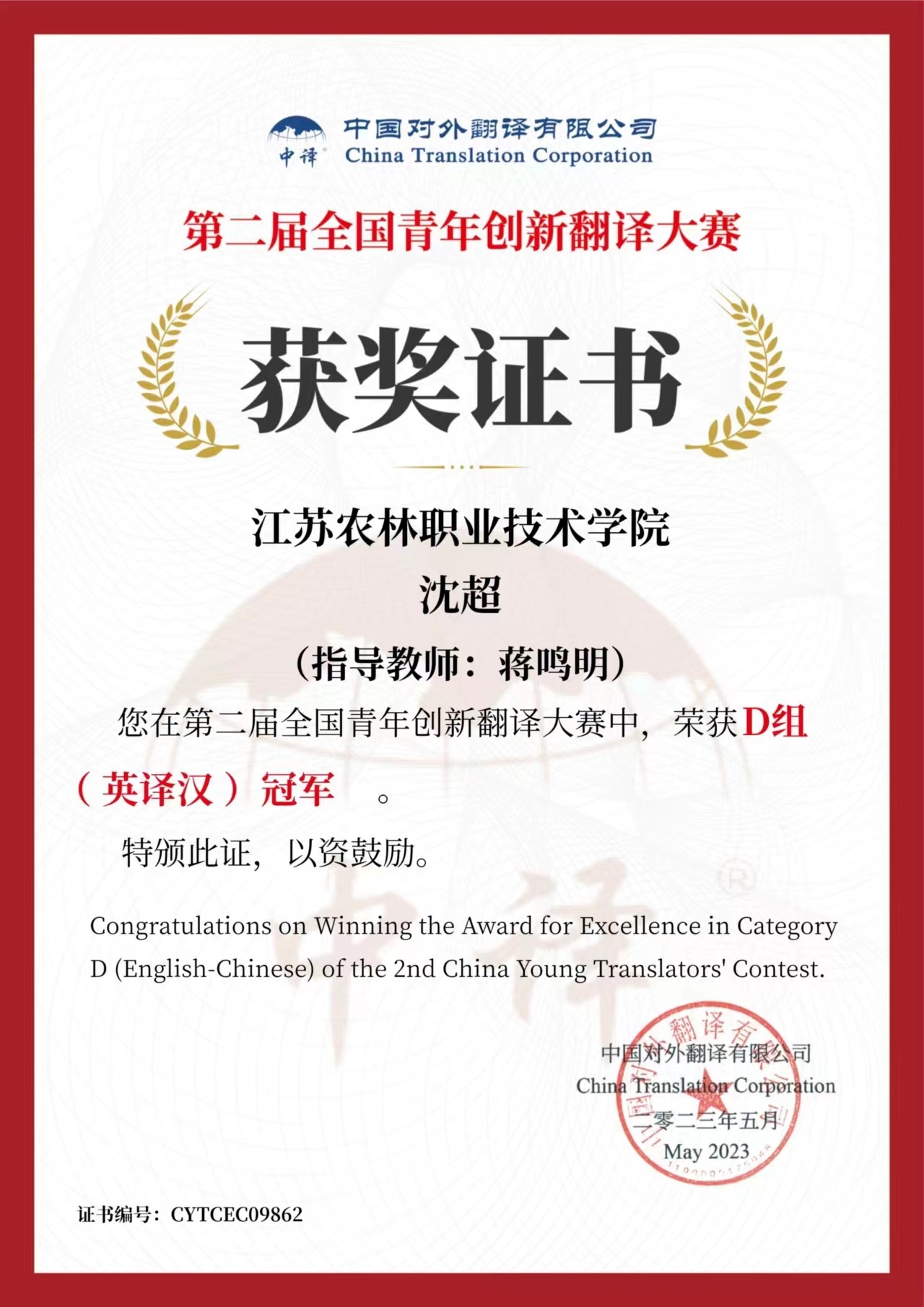 近日,由中国对外翻译有限公司主办的第二届全国青年创新翻译大赛成绩揭晓,茶与食品科技学院22级农业生物技术专业沈超同学凭借扎实的翻译功底,在专科组英译汉赛项中发挥出色,取得全国冠军的好成绩。