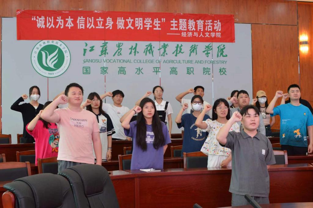 组织诚信宣誓。邀请办理生源地助学贷款学生代表、2023年度“江苏省优秀学生干部”20文秘梅克发同学进行领誓,现场同学们集体宣誓,并签订诚信还款承诺书,立下守信诺言。
