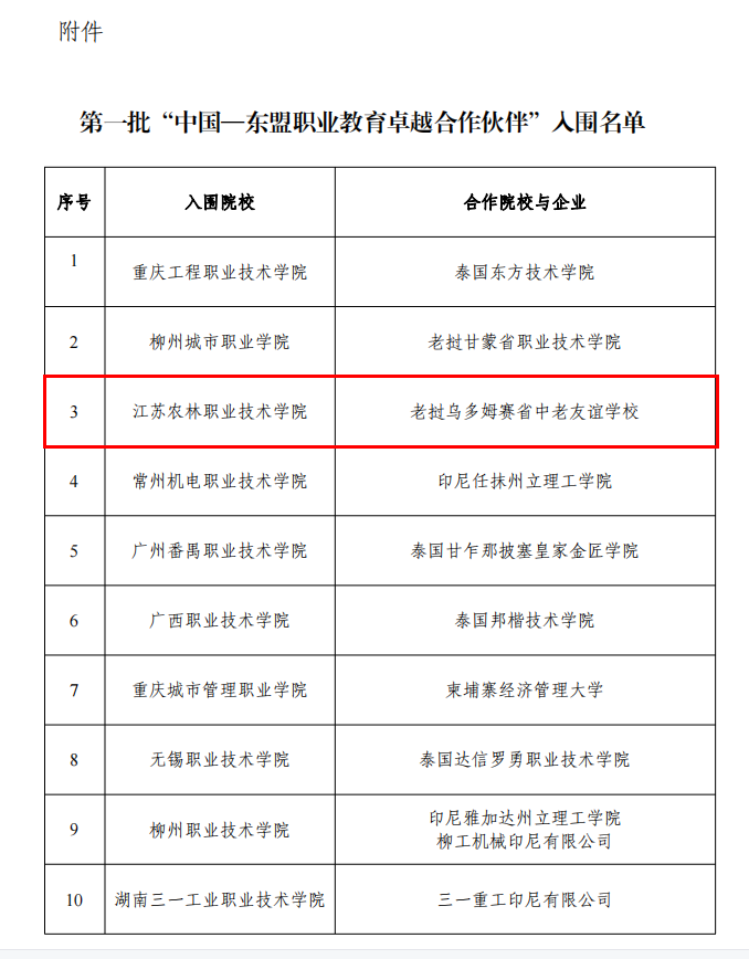 2022年8月,在教育部国际合作与交流司支持与指导下,中国教育国际交流协会发起成立中国-东盟职业教育联合会,以推动中国与东盟各国职业教育合作深入发展,树立合作典范、发挥示范作用,于2023年3月启动“中国-东盟职业教育卓越合作伙伴”遴选,并于近日面向全国遴选评议出20所为中国-东盟职业教育发展做出示范引领和辐射带动作用的院校和企业。