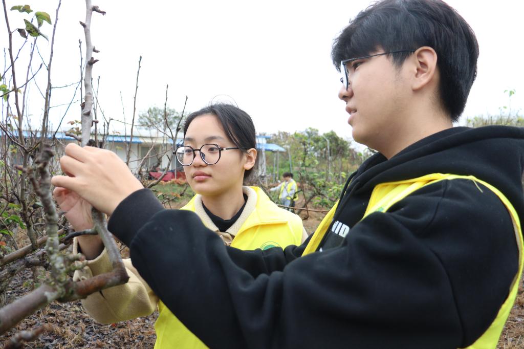 11月10日上午,农学园艺学院新禾助农服务团成员来到“全国农村青年致富带头人”华梦丽学姐的果牧不忘家庭农场,开展“让青春赋能,赴新农田头”实践活动,向学姐学习果树管理技能。