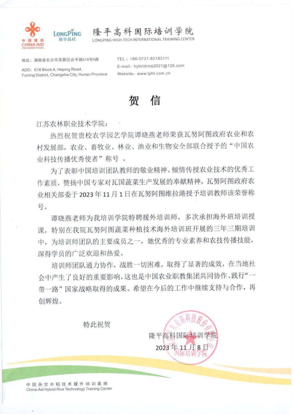 2023年11月8日,隆平高科国际学校发来贺信,热烈祝贺农学园艺学院谭晓燕老师荣获瓦努阿图政府农业部、畜牧业、林业、渔业和生物安全部联合授予的“农业科技传播中国优秀使者”称号 。