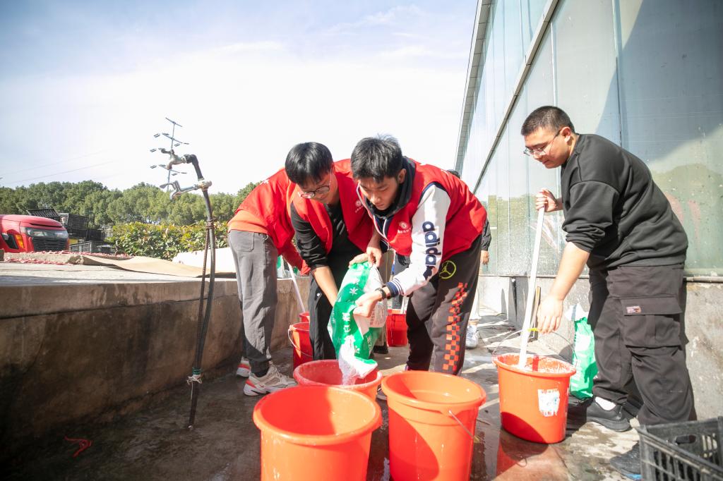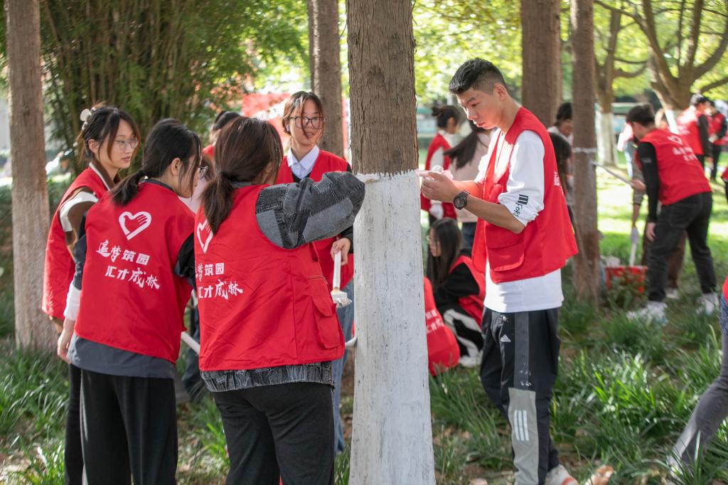 报名此次活动的志愿者有退役复学大学生、有入党积极分子,还有党员教师,他们组成了“护林先锋队”,给即将过冬的树木进行了涂白。从事校园养护的党员教师任焕焕说,“现在气温逐渐降低,各类树木由生长期转入休眠期,此时是树木养护的重要时期。我们涂白用的材料在防冻、杀菌的同时能够被树木吸收,从而有效提高了树木的抗虫性,促进树木的健康生长。同时,每棵树标定基准线,规定刷白高度为1.2米左右,刷白后高度整齐划一,能起到一定的美观视觉效果。”志愿者们将石灰与石硫合剂按照一定配比进行混合,拿着石灰桶和刷子,将防护剂自上而下地均匀涂抹在树干上,刷白过的树木整齐划一,一颗颗树木瞬间换了“新衣”,构成了校园内一道美丽的风景线。