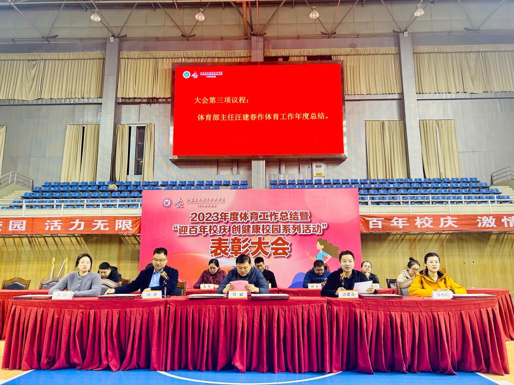 12月7日晚,永利官网2023年度学生体育工作总结暨“迎百年校庆 创健康校园系列活动”表彰大会在体育馆举行。体育部直属党支部书记汤波主持。