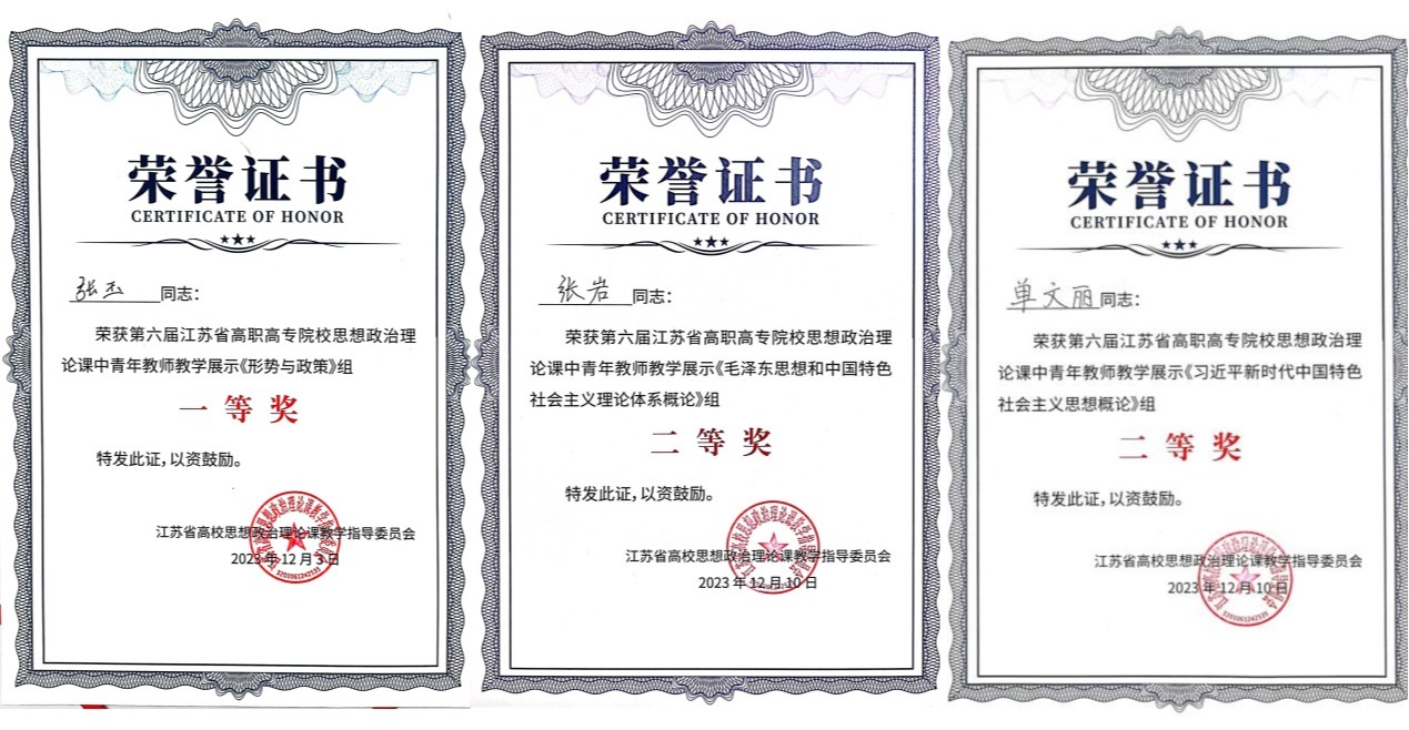 12月10日,第六届江苏省高职高专院校思想政治理论课中青年教师教学展示活动落下帷幕。马克思主义学院张玉老师荣获《形势与政策》课程组一等奖,单文丽老师荣获《习近平新时代中国特色社会主义思想概论》课程组二等奖,张岩老师荣获《毛泽东思想和中国特色社会主义理论体系概论》课程组二等奖,为学院百年华诞添彩。