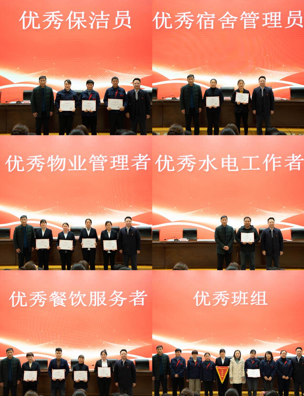 后勤负责人宣读了百年校庆后勤保障工作优秀员工名单,到场领导分别为优秀保洁员、优秀宿舍管理员、优秀物业管理员、优秀水电工作者、优秀餐饮工作者、优秀班组代表颁发了证书并合影留念。