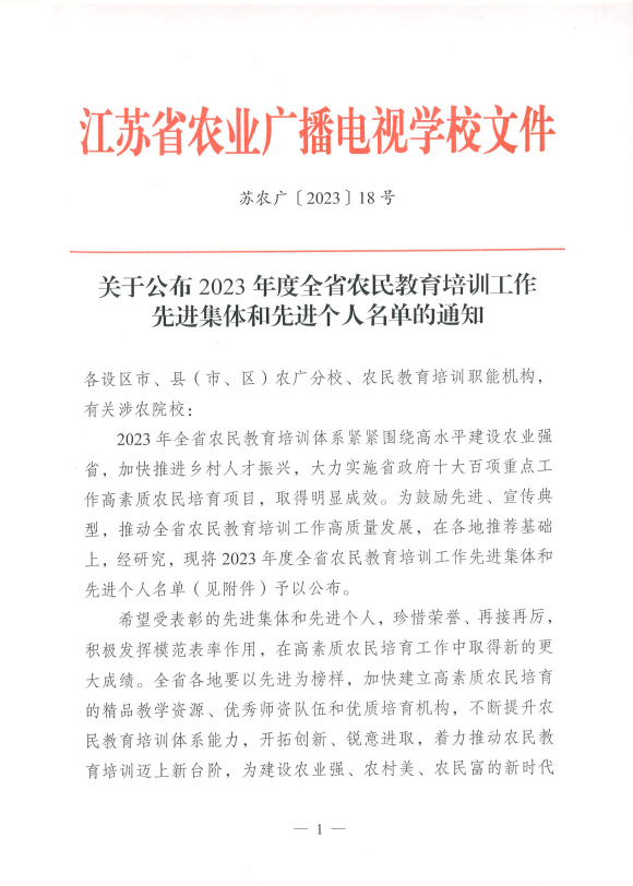 近日,江苏省农业广播电视学校发布《关于公布2023年度全省农民教育培训工作先进集体和先进个人名单的通知》(苏农广〔2023〕18号),乡村振兴学院荣获全省农民教育培训工作先进集体。