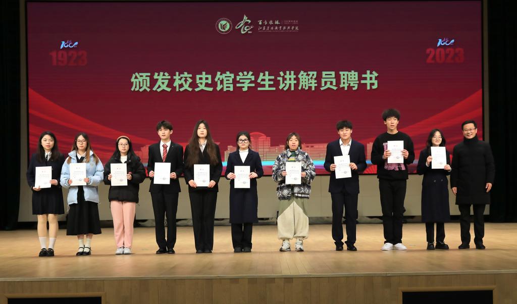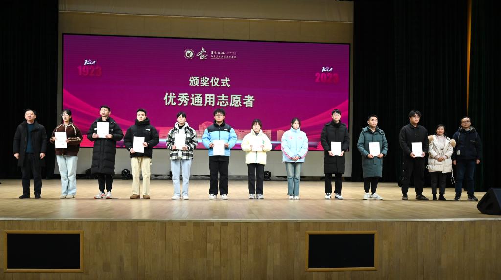 团委负责人宣读了百年校庆优秀志愿者名单,到场领导分别为优秀通用志愿者、优秀礼仪、讲解志愿者和优秀演员志愿者代表颁发证书。大会现场,毕德全还为校史馆首批学生讲解员颁发了聘书。
