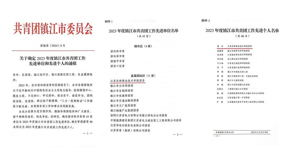 一年来,团委在学院党委和镇江团市委的坚强领导下,坚持以习近平新时代中国特色社会主义思想为指导,持续深化共青团改革和建设,着力构建“三力一度两保障”工作格局,打造学生身边的一流共青团。组织青年师生先后获得2023年全国大中专学生志愿者暑期文化科技卫生“三下乡”社会实践活动优秀个人、中国大学生自强之星、最美职校生、“挑战杯”中国大学生创业计划竞赛国赛银奖、“挑战杯”全国大学生课外学术科技作品竞赛“黑科技”展示活动国赛一等奖(恒星级)、省杰出青年岗位能手、全省“我们身边的好青年”、省“母亲河奖”绿色团队奖、全省学生“学宪法讲宪法”活动优秀组织奖、省大学生知识产权演讲比赛“优秀院校组织奖”、全国青年科普创新实验暨作品大赛江苏赛区优秀组织单位等省级以上荣誉称号。