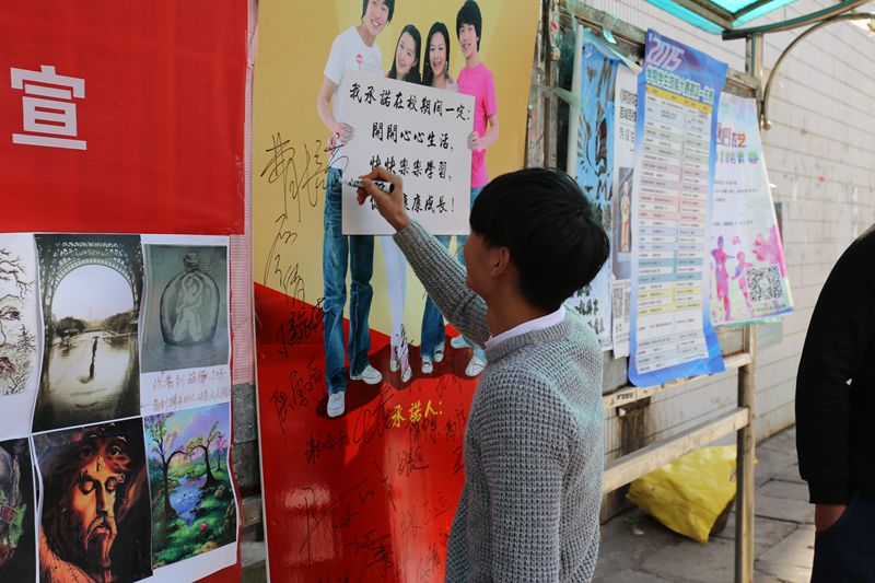 为了宣传普及心理健康知识,提升大学生关注自身心理健康的意识,并引导他们正确处理学习、工作和生活中存在的问题,使他们能够开心快乐地度过自己的大学生活,学院心理健康教育中心组织开展了“交出你心,说出你情,送给你爱 ”——12·5(要爱我) 心理活动。12月4日中午,由人文艺术系承办的趣味心理图片手绘展和校园契约书活动在宿舍区举行。