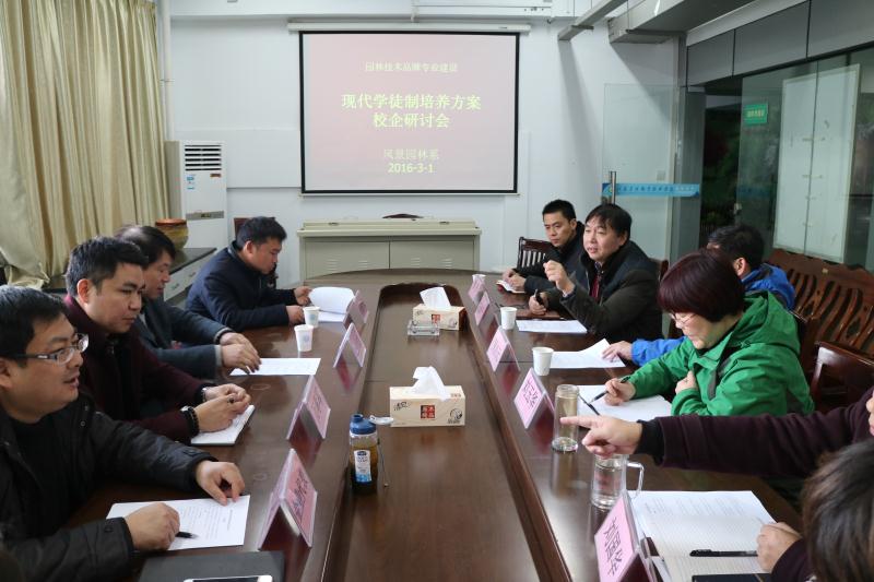 项目负责人熊伟汇报了“园林技术现代学徒制订单班”实施方案并提出了先行组织“学徒制实验班”,明确试点规模、试点层次和实施步骤,签订“定向培养协议”等建议。王永平主任则建议“招生即招工”、“师傅带徒弟”、“园林施工前沿化”。参会企业代表针对学生进驻企业教学时间、教学实训场所、生活待遇、安全保障等方面提出意见,表示要形成校企联合招生、联合培养、一体化育人的长效机制,切实提高生产、服务一线劳动者的综合素质,提升企业核心竞争力。