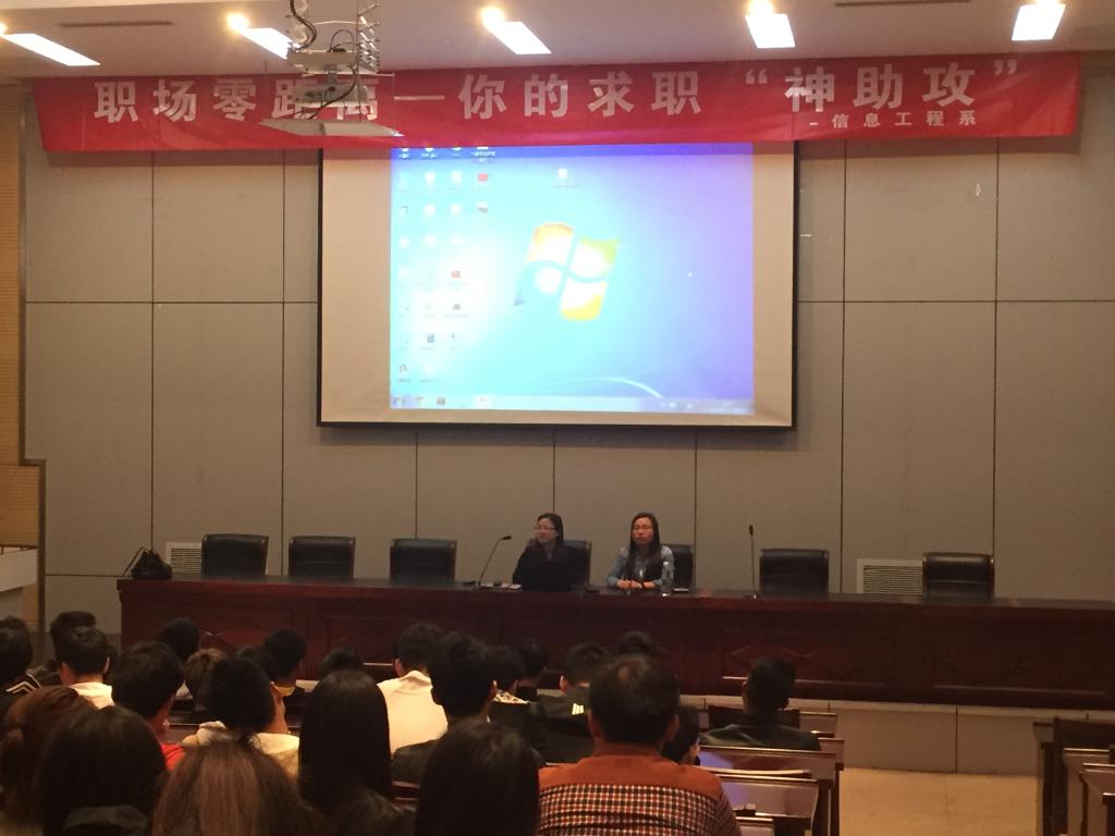 4月24日晚,信息工程系在研发楼报告厅举办了“职场零距离”主题讲座。讲座特邀现任南京科思集团总经理助理兼人力资源负责人、高级人力资源师吕美红女士。 讲座共吸引120多名师生参加,现场气氛活跃。吕美红女士分别从宏观和微观角度为同学们介绍毕业生数量、就业形势、职业生涯、认识和了解自我、简历制作及面试注意事项等方面相关知识,给同学们带来更多的启迪和震撼。 此次讲座为毕业生更好的确立价值观、择业观和就业观,进一步做好信息工程系毕业生就业指导工作起到了积极的促进作用。