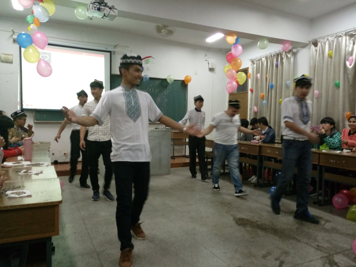 联欢会上,维族同学们身着民族服装,跳起了维吾尔族舞蹈。17名和维族同学结对互助的志愿者们也积极参加,通过互相合作完成的小游戏增进彼此之间的感情交流。校区相关领导也到场和同学们共度节日。同时,校区分团委还通过校园广播,编制了一期特殊节目,为维族同学送出好听的维族音乐,表达深深的节日祝福。
