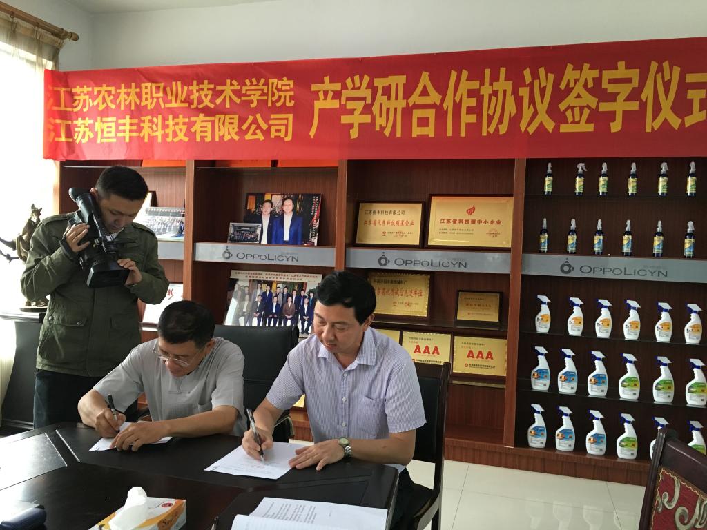 江苏恒丰科技有限公司是2012年末与台湾仁维国际股份有限公司技术合作创立的科技环保型企业。公司专注于综合微生物菌种培殖、菌剂研发、推广和应用、水土有机改良、治理等领域的工程项目。苏进总经理首先介绍了公司的生产销售情况。并陪同参观了公司生产车间。随后,双方就校企合作事宜展开洽谈,并签订了合作协议,举行了校外实习基地授牌仪式。