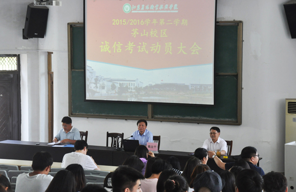 大学英语等级考试和期末考试即将临近,为规范考试过程,保证考试质量,严格考试纪律,营造积极向上的考试氛围,树立良好的考风学风,6月14日下午,茅山校区管委会在校区学术报告厅召开诚信考试动员会。校区相关负责人、各班级辅导员及学生代表参加了本次大会。