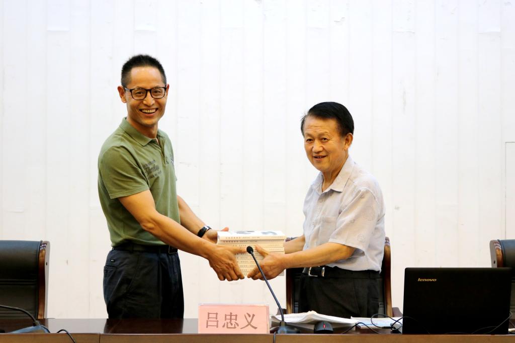 学院图书馆张田林馆长接受吕忠义教授的著作,并对其热心农林教育事业,广泛宣传园林专业知识表示敬佩。