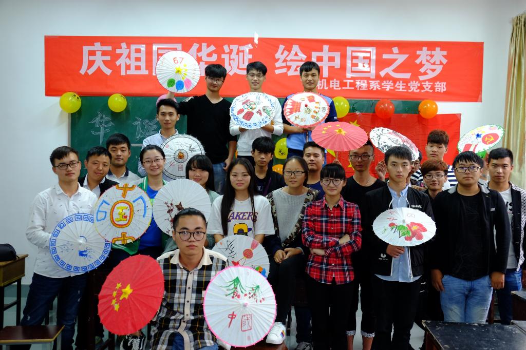 岁月承载着历史的脚步,祖国迎来了第67个生日。9月29日下午,机电工程系学生党支部在文科楼211举办了以“贺祖国华诞 绘中国之梦”主题伞绘活动,吸引了来自学院各系同学的踊跃参与。