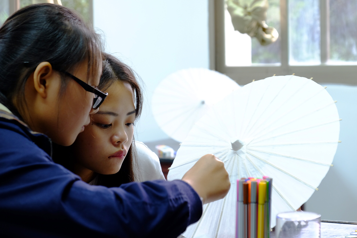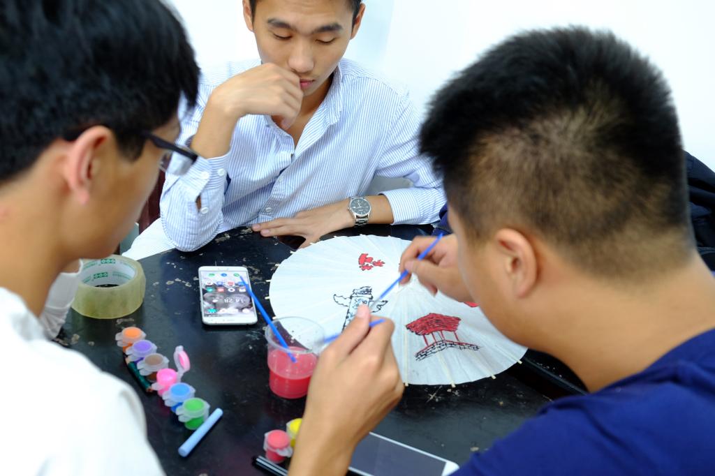 活动中,同学们在直径为40cm的宣纸伞面上进行绘画,以爱国、爱党、爱生活的主题尽情挥洒激情。虽然大家没有专业的艺术学习经历,但他们仍一笔一画,精心绘出自己对祖国华诞,繁荣富强的美好祝愿。