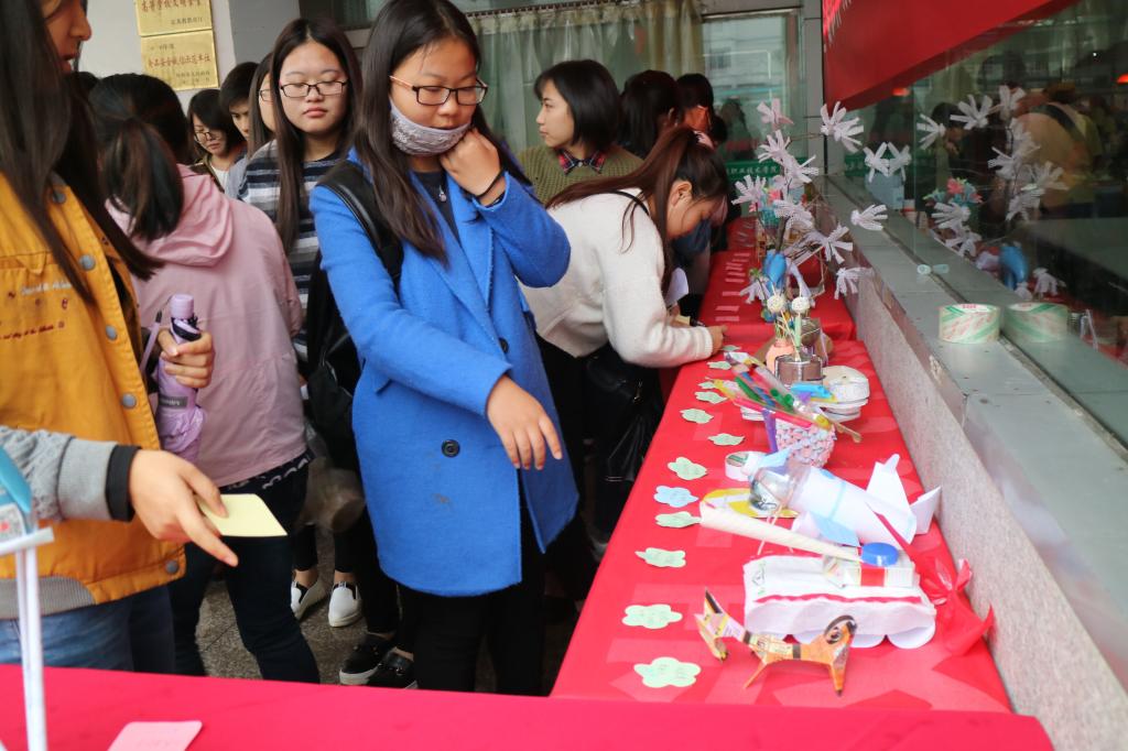 10月31日是世界勤俭日,为了号召同学们勤俭节约,养成节约的好习惯。近日,风景园林系分团委举办了“变废为宝看农林,成由勤俭败由奢”废品再利用展示大赛。塑料瓶、麻绳、废纸,这些随处可见的废旧品经过设计者们的巧思妙想,成为一件件创意无限的工艺品。10月28日中午,大赛的投票环节在食堂门前举行,参与投票的同学对这些作品赞赏有加,纷纷为自己欣赏的作品投下宝贵的一票。