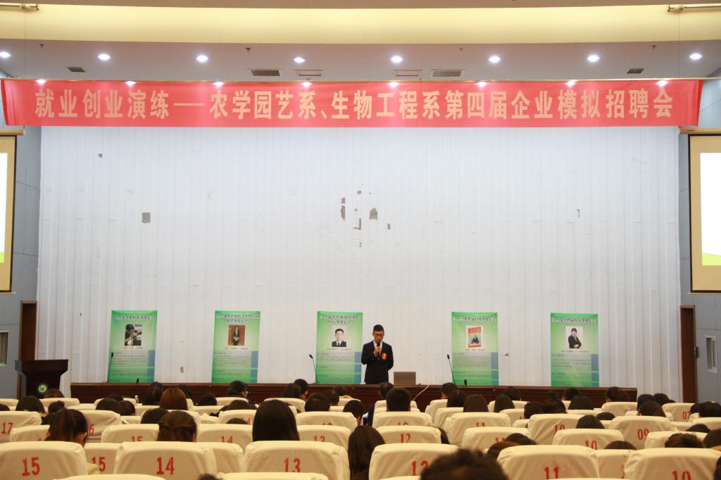 11月23日,由学院学工处学生就业创业指导中心主办,农学园艺系、生物工程系联合承办的第四届“擘划人生蓝图,职业成就梦想”企业模拟招聘会在学院图书馆报告厅成功举办。