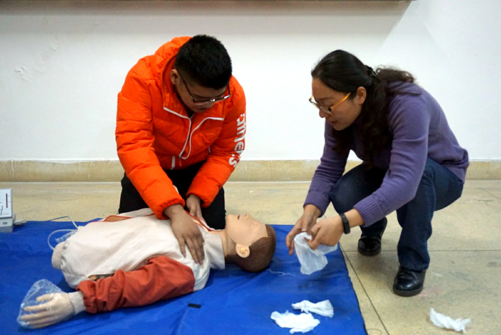 活动现场,专业救护讲师沈云霞医生指导同学们学习急救的动作要领,以及遇突发事故时如何进行心肺复苏、安全转运等。讲解环节结束后,沈医生邀请同学们重复示范了现场急救的过程,让大家掌握实际救助经验。