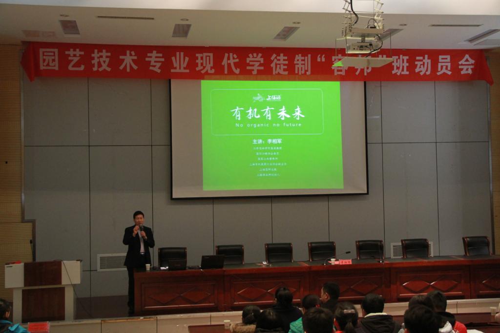 近日,上海容邦投资管理集团(上膳源)董事长李相军一行14人来永利官网开展园艺技术专业现代学徒制“容邦”班动员会暨“有机有未来”主题讲座。动员会在学院研发楼报告厅举行,农学园艺系系部相关老师、150多名学生参加了讲座。