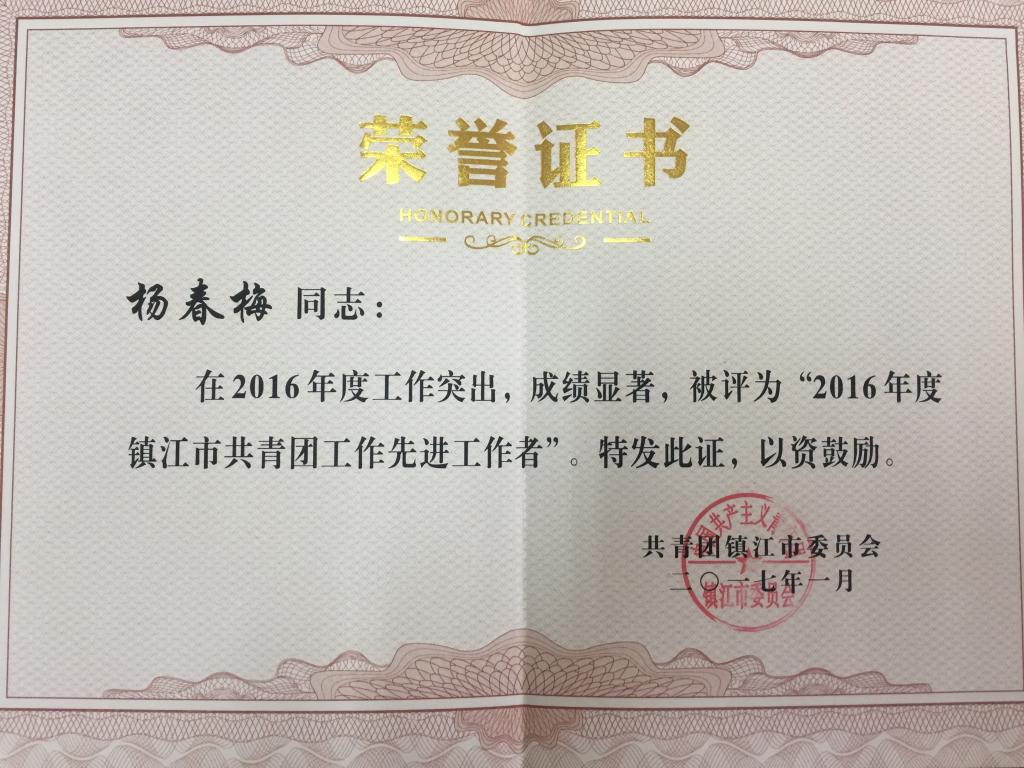 近日,共青团镇江市第十六届委员会第六次全体会议在镇江召开,会上对2016年度镇江市共青团工作先进单位和先进工作者、镇江市共青团工作创新创优成果等进行了表彰。