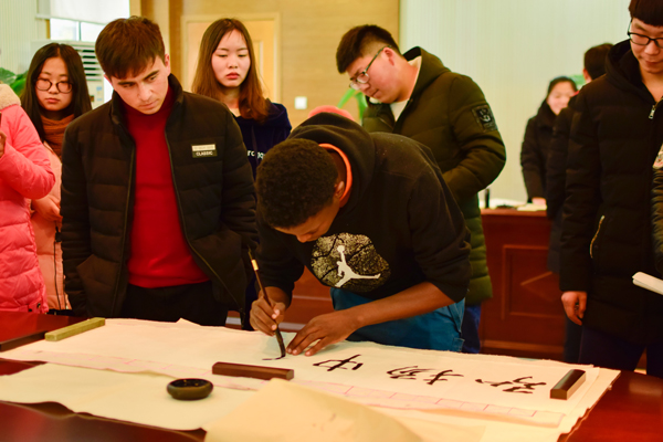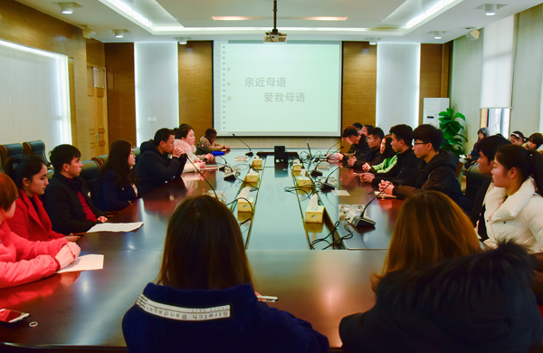 汉字作为中华文化传承的载体,包含了一代代先人们的智慧结晶。为亲近母语,传承经典,积极响应中央“增强文化自信”的号召。近日,由茅山校区分团委主办的“亲近母语,爱我母语”主题宣传活动在图书馆会议室展开。校区分团委书记朱锦老师、书法社指导老师赵新来老师、信息工程系学生会同学、外国留学生、维吾尔族学生代表和书法社团的同学参加了此次活动。