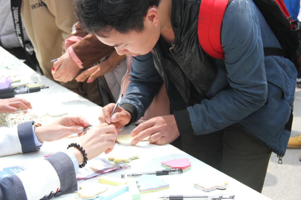活动在热烈的开场舞PPAP中拉开序幕,“敞开心怀拥抱快乐”环节中,工作人员穿着卡通人物服装,给路过的朋友、同学爱的抱抱,与其合影留恋并写下祝福语。“说出心里话关爱身边人”环节,通过视频播放在校部分师生、宿管员、食堂阿姨等人对同学及他人的祝福和关心。在“举手之劳,解他人之难”活动中,现场工作人员收集学生坏损的生活用品,收集后分类整理维修,现场共收集到20多件需要维修的物品,以自己的举手之劳,解决他人之困难。活动现场还放置一个大纸箱,箱内放有需要完成各项任务的小纸条,同学们随机抽取一个,根据纸条提示完成对应任务便可领取礼品一份。