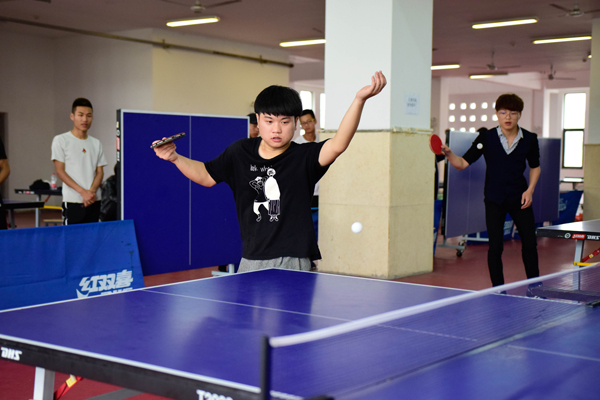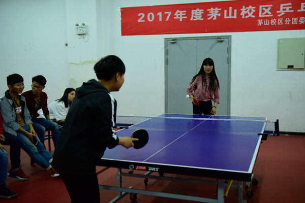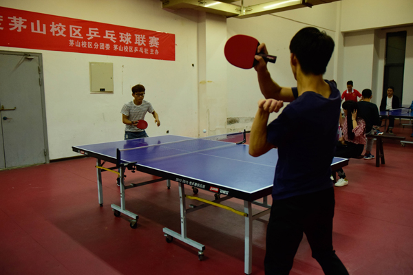 为增强学生体质、丰富校园生活,5月8日晚,校区分团委联合乒乓球社团在乒乓球室开展了以“我运动,我健康,我快乐”为主题的乒乓球决赛。 在分团委学生会、社团工作人员的组织下,比赛秉着公平,公正,公开的原则进行,现场的气氛十分的活跃。比赛分为几个阶段进行,观看比赛的同学们不时为选手们的绝妙的扣杀而欢呼。比赛共有76名同学参加,经过层层角逐,最终,16家具设计与制造班的蔡子轩和16药品质量与安全班的叶希希分别获得男单女单冠军。