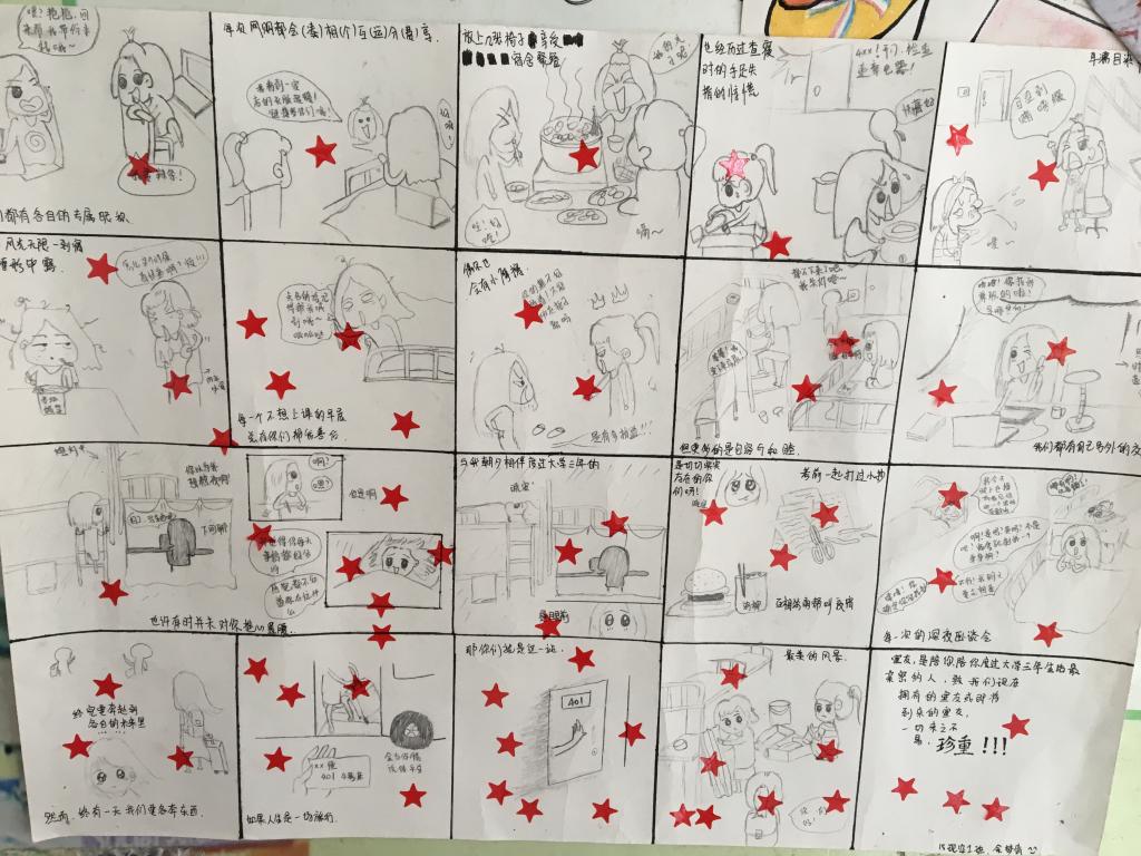 活动现场展出了同学们精心制作的宿舍生活漫画,画中有平淡的生活日常、有嬉戏打闹的趣味、有专心学习的气氛、有酣睡不醒的懒惰、有交心畅谈的放、有激战游戏世界的兴奋等等,展示了同学们多彩的大学生活。可爱的画风加上有趣的文字,那一张张漫画就成为了宿舍生活微缩影,真实而温馨。