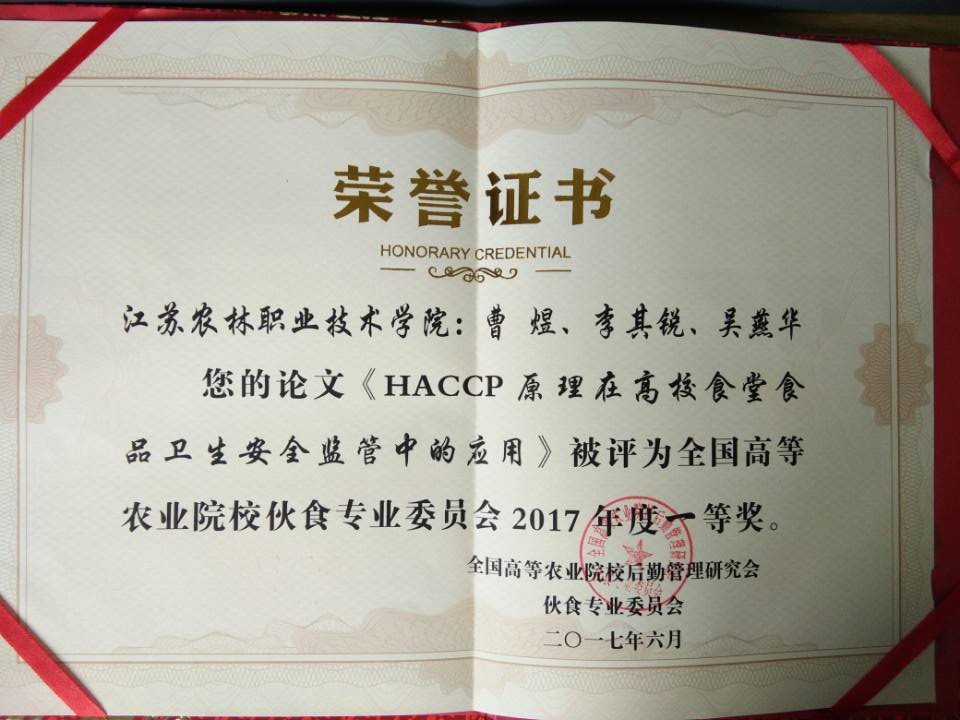 永利官网被评为“2017全国高等农业院校伙食管理工作先进单位”,曹煜同志被授予“全国高等农业院校伙食管理工作先进工作者”,《HACCP原理在高校食堂食品卫生安全监管中的应用》和《浅谈高校食堂社会化服务外包监管体系的研究–以77779193永利集团为例》分别荣获年度优秀论文一等奖和三等奖,同时学院被推选为全国高等农业院校伙食专业委员会理事单位。