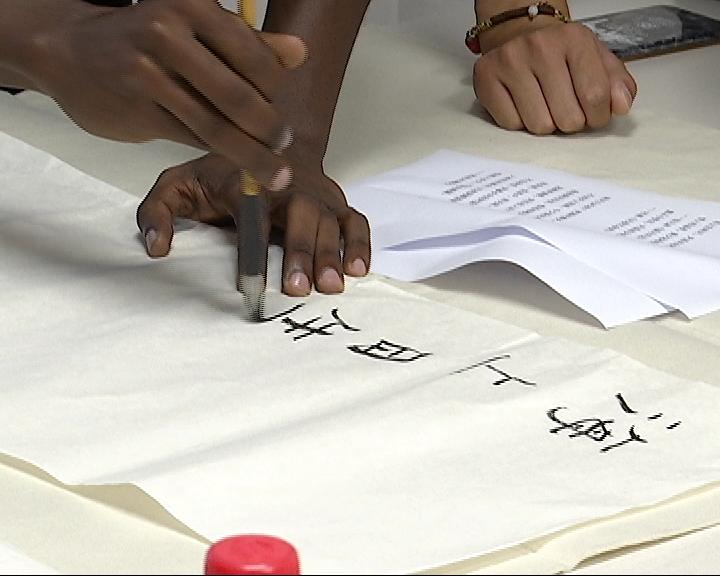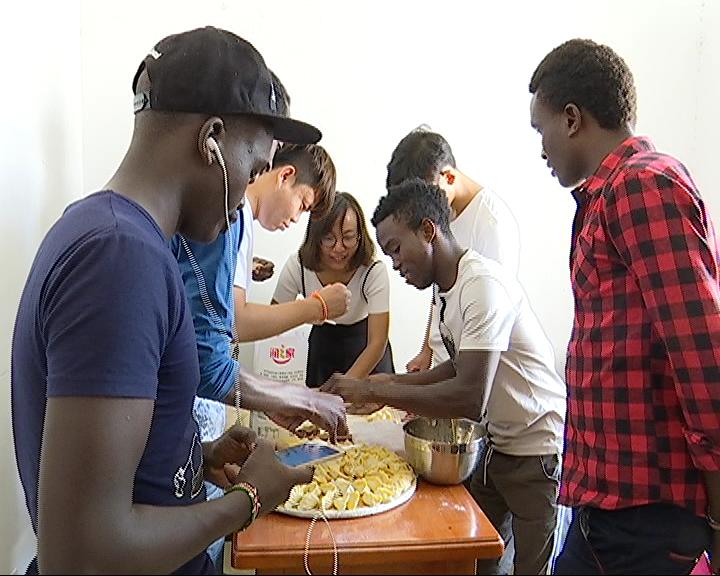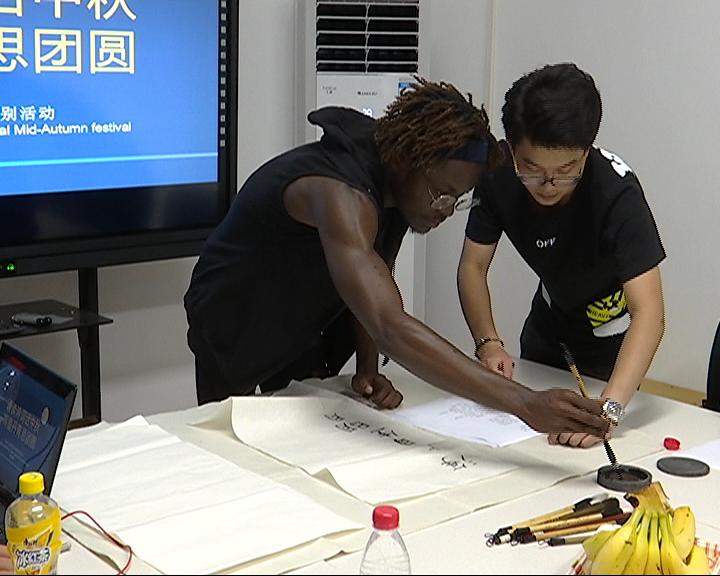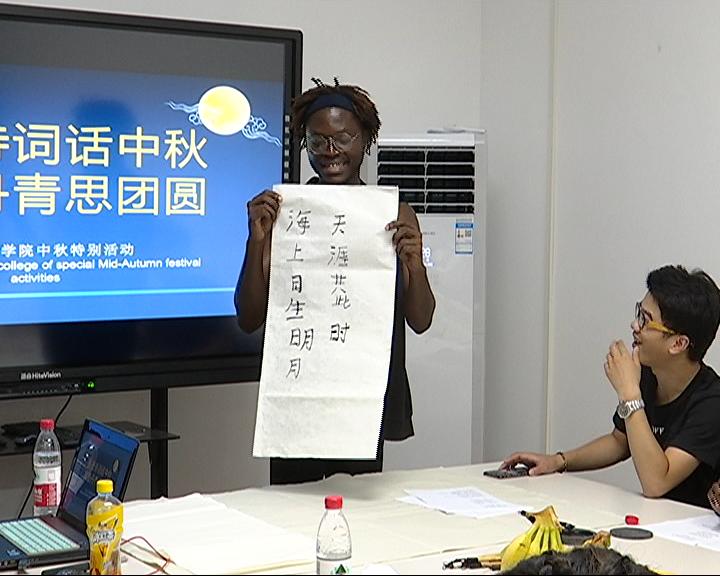 22日上午,来自肯尼亚、刚果、老挝等国的9位留学生欢聚在工科楼,一起诵读中秋节诗歌,一词一句表达了远方家人的思念。刚果留学生张景对中国书法非常感兴趣,现场他现学现用,挥笔“海上生明月、天涯共此时”。此后的留学生互动环节,师生们共同品尝各式月饼,分享中秋故事。中午十分,在留学生劳伦斯的宿舍,在中国学生的演示下,留学生们手擀饺子皮,花式捏饺子,在欢声笑语中品尝“家”的味道。