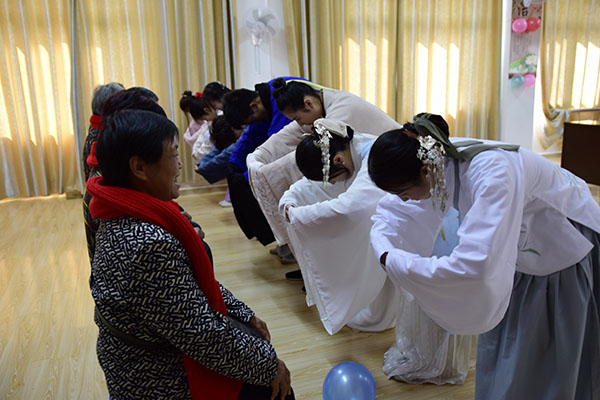 本次活动由针爱行动、“礼”敬老人、重返“十八岁”、 爱驻夕阳、点赞十九大五个环节组成。在针爱行动环节中,志愿者为爷爷奶奶们戴上他们亲手织的围巾,希望他们在寒冬里,身体和心灵上都能获得一份温暖;“礼”敬老人环节中,志愿者们身着汉服,模仿古时的礼仪以小辈的身份向长辈行礼并送上了重阳糕,送上了自己最真挚的祝福;重返“十八岁”环节中,志愿者们利用新颖的拍摄软件为老人们拍摄“萌照”,拉近老人与年轻人之间的距离;爱驻夕阳环节中,志愿者们载歌载舞,为爷爷奶奶们呈现了一个个精彩的节目,《当你老了》、《父亲》、《魔术》、《筷子舞》、《二人转》……年轻人的无限活力与灿烂笑容深深的感染了爷爷奶奶们,他们和志愿者们打成一片,现场笑声不断;活动最后,志愿者与老人们怀着浓烈的爱国情怀,齐诵《读中国》,献礼十九大,点赞中国,希望祖国繁荣昌盛!