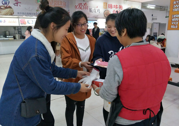 11月23日,“心馨园”心理协会的同学们,带着精心准备的小礼品,为校区的清洁工阿姨们送上了最衷心的感恩问候,同学们为清洁工阿姨换上了崭新的护袖、口罩,随后也一起加入了清理校园杂物的行列中。