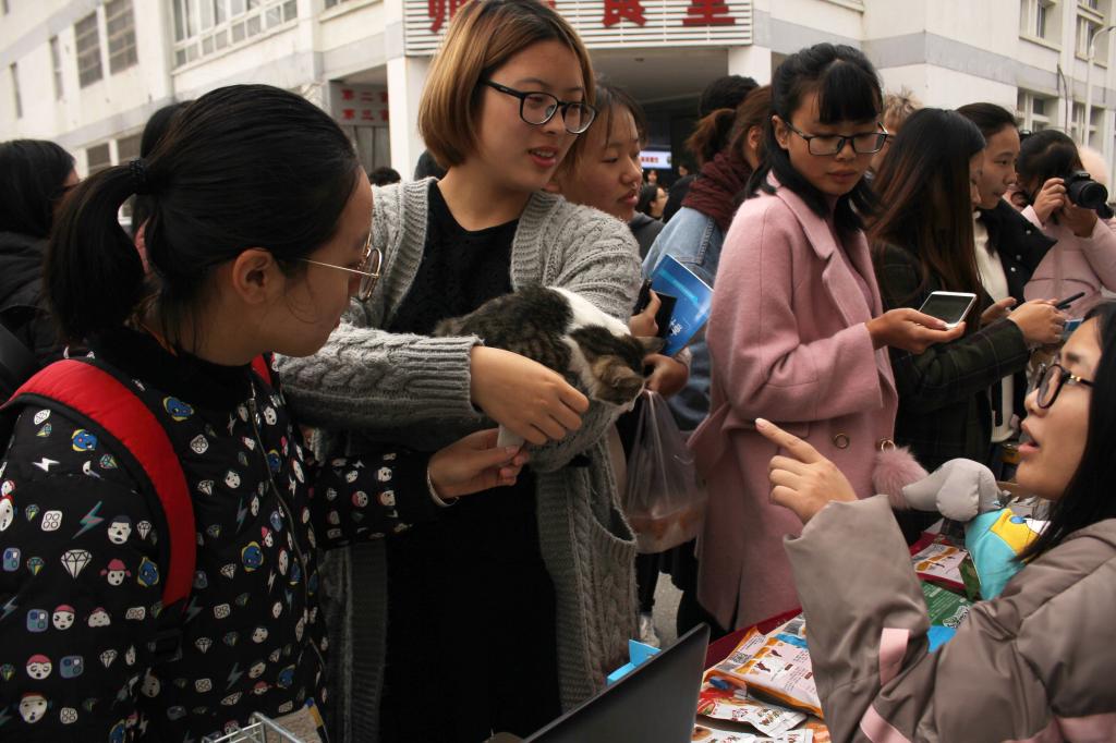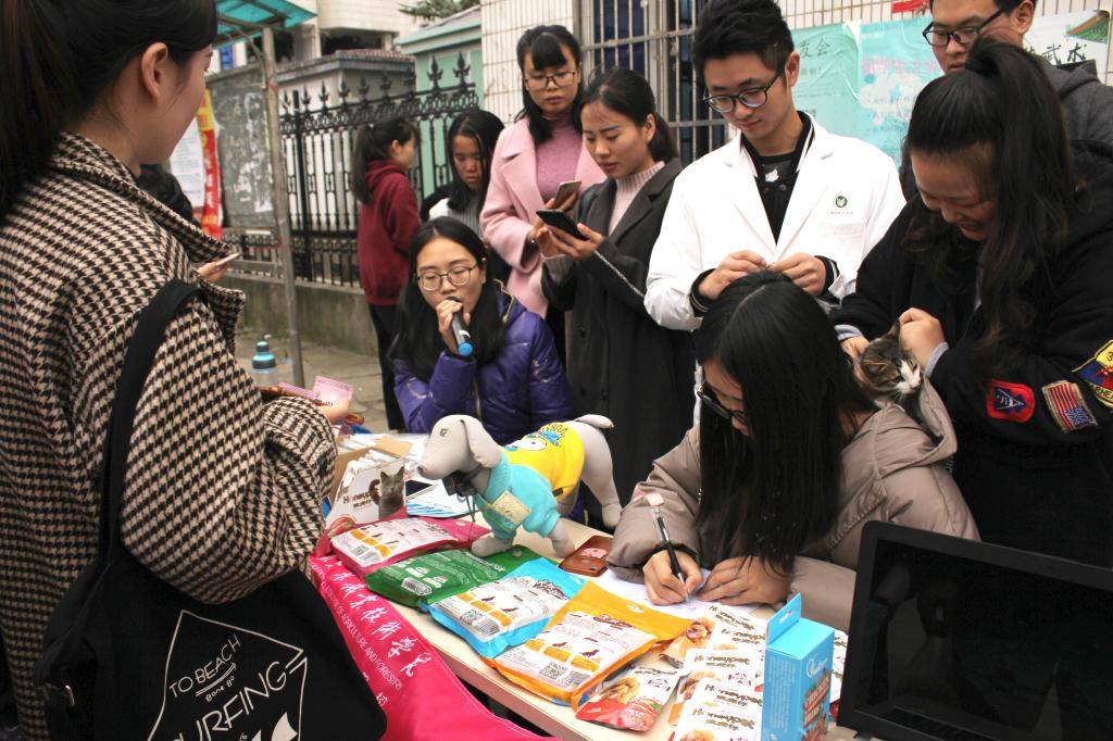 活动现场,电脑循环播放关于流浪猫的视频,讲解流浪猫的危害和流浪猫绝育的意义,社团成员们向过往学生示范猫笼的正确使用方法并进行猫零食及相关用品的义卖。