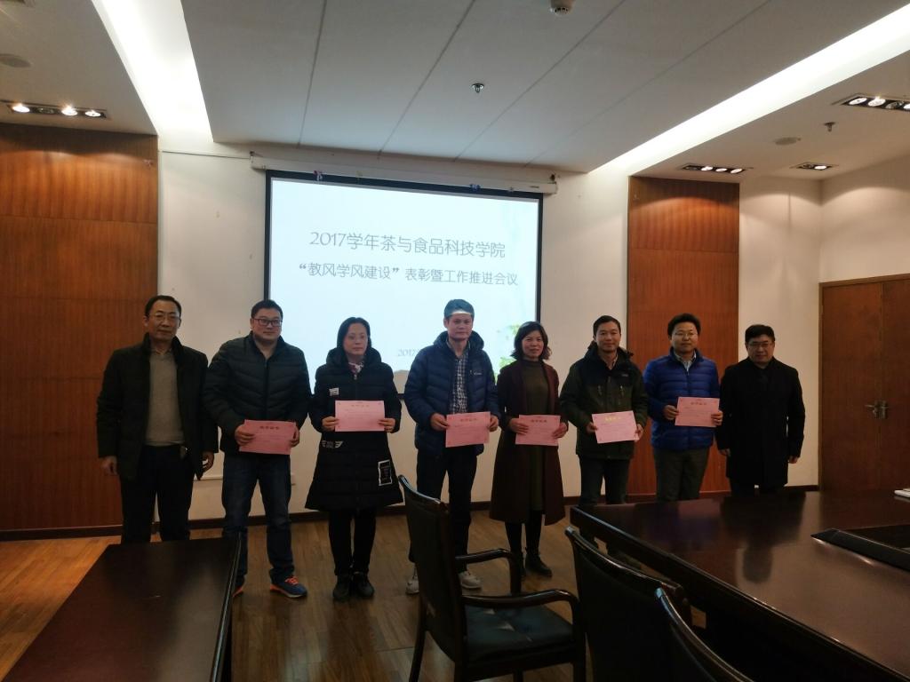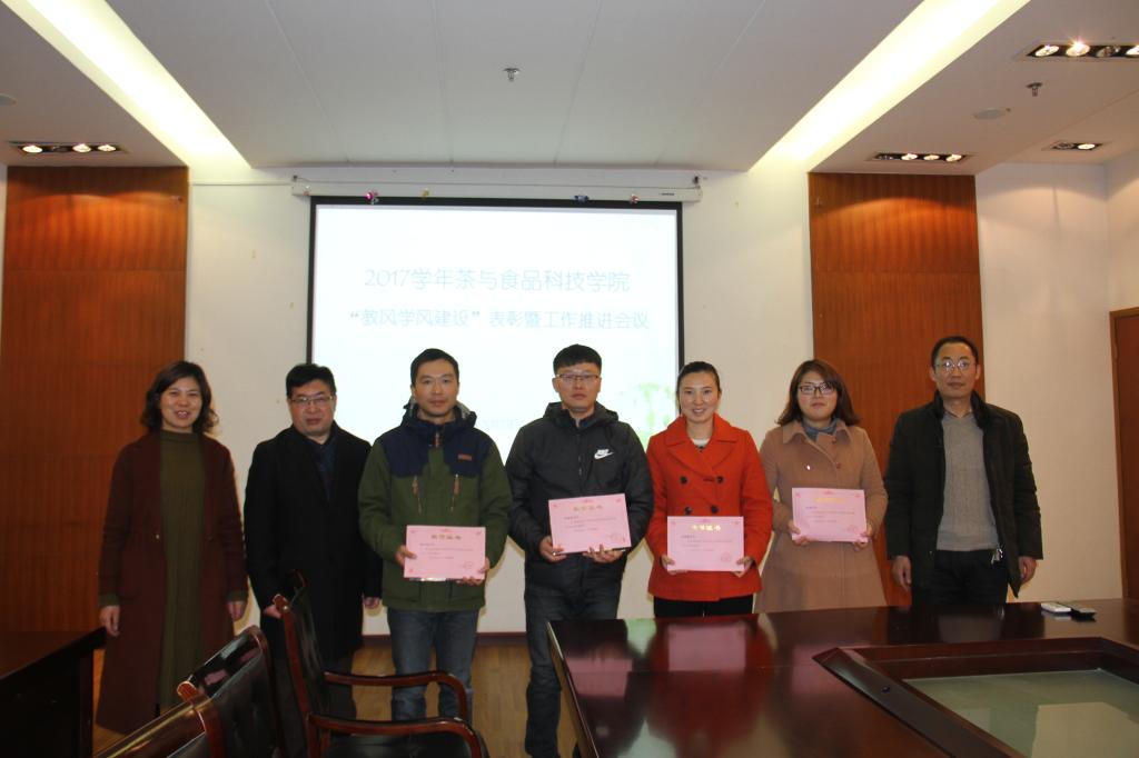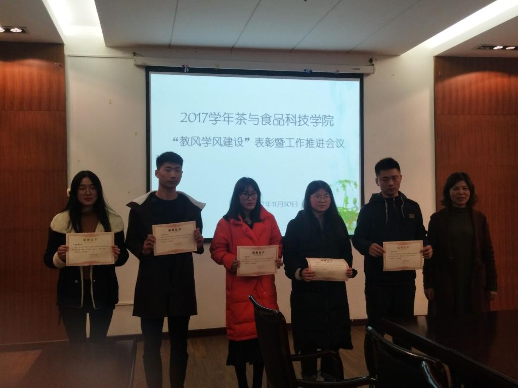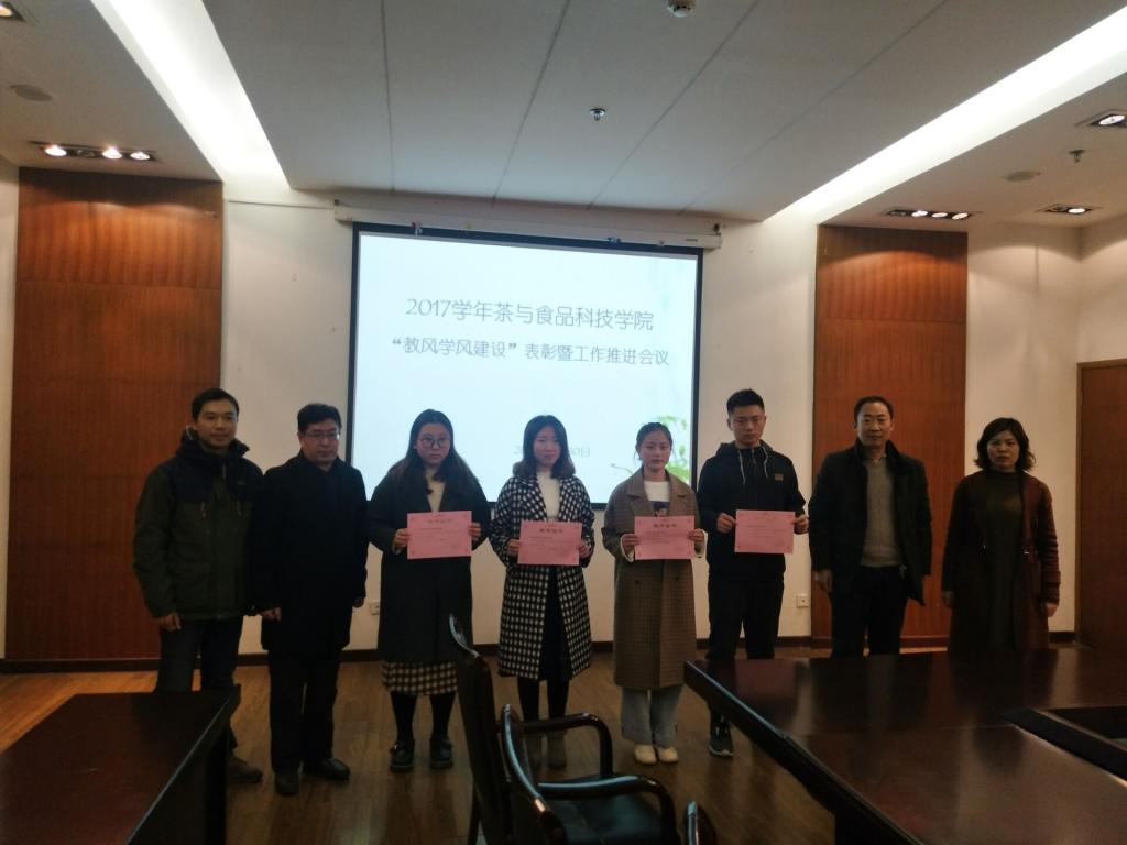 11月30日,茶与食品科技学院在图书馆中层干部会议室召开2017年“教风学风建设”表彰工作推进会议,党总支书记李静、副院长童斌、党总支副书记谢春芹,督导老师汤正元及相关教师、学生参加了会议。