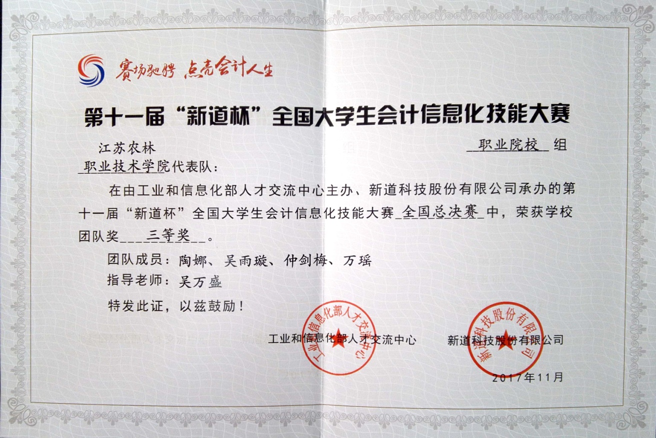 近日,第十一届“用友新道杯”全国大学生会计信息化技能大赛总决赛在江苏经贸职业技术学院 举行,我校经济与人文学院教师吴万盛、童莉莉老师带队,2015级财务管理专业8名学生组队参加。凭借稳定、出色的场上发挥,最终斩获团体三等奖,六名学生获得个人奖项,其中一个二等奖,五个三等奖。指导教师吴万盛和童莉莉获得“优秀指导教师”称号等。