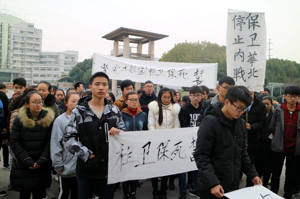 活动以重现“一二·九”运动情景为主线,学生代表带领师生们集合在北校区香樟树前,回顾了1935年12月9日北京数千大中学生“反对华北自治,反抗日本帝国主义,要求保全中国领土的完整”这一爱国壮举,同学们现场制作了“誓死保卫祖国”等标语,师生带着敬畏与热忱举着标语牌重演了前辈们的示威游行来到体育馆门前,学生代表用“别让我们的心太过于麻木”、“星星之火,必可燎原”的现场演讲,激励现场所有青年团员奋斗不息、爱国不止。最后,现场师生高举拳头庄严宣誓:为中华之强大而努力奋斗!