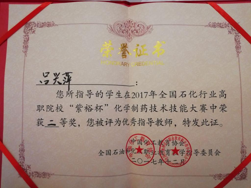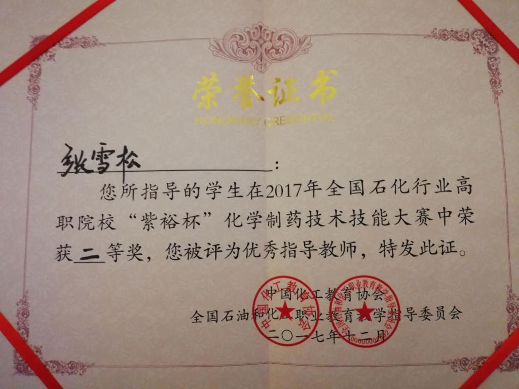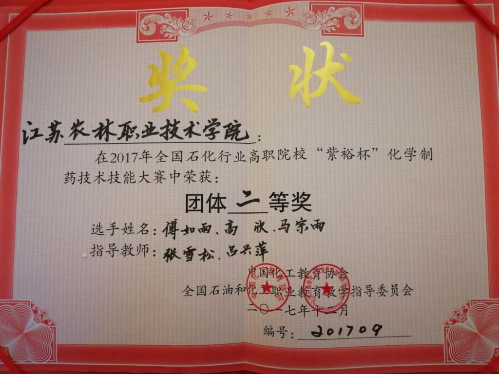 12月26-28日,2017年全国石化行业高职院校“紫裕杯”化学制药技术技能大赛在吉林工业职业技术学院隆重举行。该赛项为团队项目,茶与食品科技学院的傅如雨、高欣、马宗雨三位同学团结协作,沉着应战,经过药品生产技术专业知识、阿莫西林生产操作、化学制药典型单元仿真操作三个环节的激烈比拼,最终获得团体二等奖。张雪松、吕兴萍两位老师荣获“优秀指导老师”的称号。