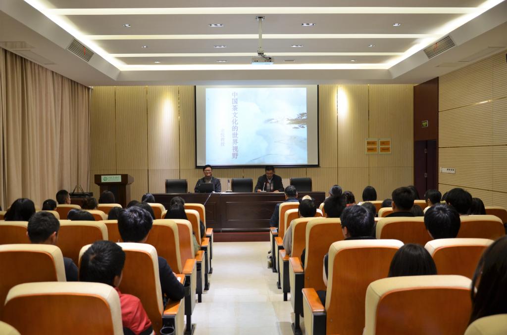 余悦教授从“中国茶艺的新动向”、“中国茶文化在美国”、“中国茶文化‘走出去’的未来之路”三个方面展开阐述,并与现场学生交流了专业定位、就业前景等方面情况。