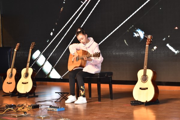 陈啸老师弹奏了的开场曲动听婉转,让观众们瞬间安静下来,细细聆听。他和他的学生带来了《叙事曲》、《寂静岭》、《白羊号角》、《成都》等曲目,旋律柔和,细水长流,缓缓浸润观众的心田。演奏间隙,陈啸老师还为现场的吉他爱好者讲解了一些弹奏技巧。