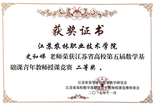 日前,由江苏省教育厅高教处、江苏省高等学校数学教学研究会举办的“江苏省高校第五届数学基础课青年教师授课竞赛”在徐州工程学院落下帷幕。共有来自全省56所高职院校近百名教师参加了比赛,我校基础部数学教师史和娣喜获二等奖。