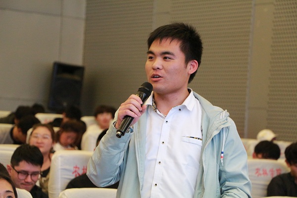 校友们从不同角度讲述了自己的在校学习、毕业实习、工作的人生经历。江苏瑞派东华宠物管理有限公司校友以大学生活和职业选择中的切身体会为例,讲述了自己如何利用大学资源、充分发掘自身潜力的经历,为同学们提供了将自身价值与职业发展结合的良好借鉴。淮安温氏畜牧有限公司校友以毕业后从业经历出发,分析了大学生就业趋势,结合自身感受,讲述了养殖行业的发展前景和人才需求,鼓励同学们做好职业规划和人生规划,明确职业发展目标,加强责任意识和担当精神,勇于担当、脚踏实地,实现自我价值与人生价值。