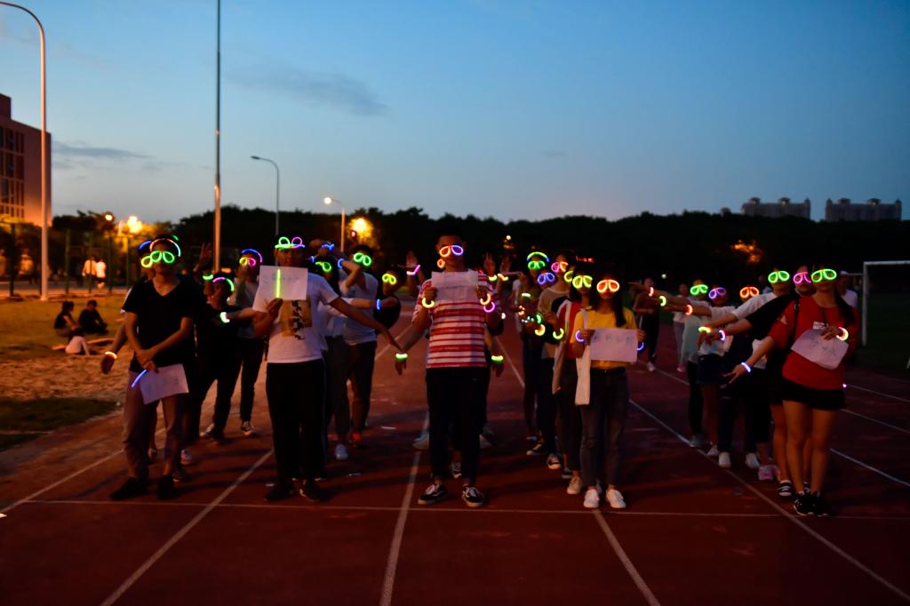 本次趣味荧光夜跑活动设立了5个站点,同学们分成5组,戴着荧光棒、荧光眼镜按照设定路线奔跑,经过各个站点分别完成“背对背拥抱”、“单排小火车”、“两人三足,足下生花、“壮志凌云,放飞烦恼、“终极之战,赢得就是我”五个挑战项目即可通关。同学们在游戏中齐心协力,团结合作,共同完成每一个站点的挑战项目。整场活动气氛热烈,笑声不断。