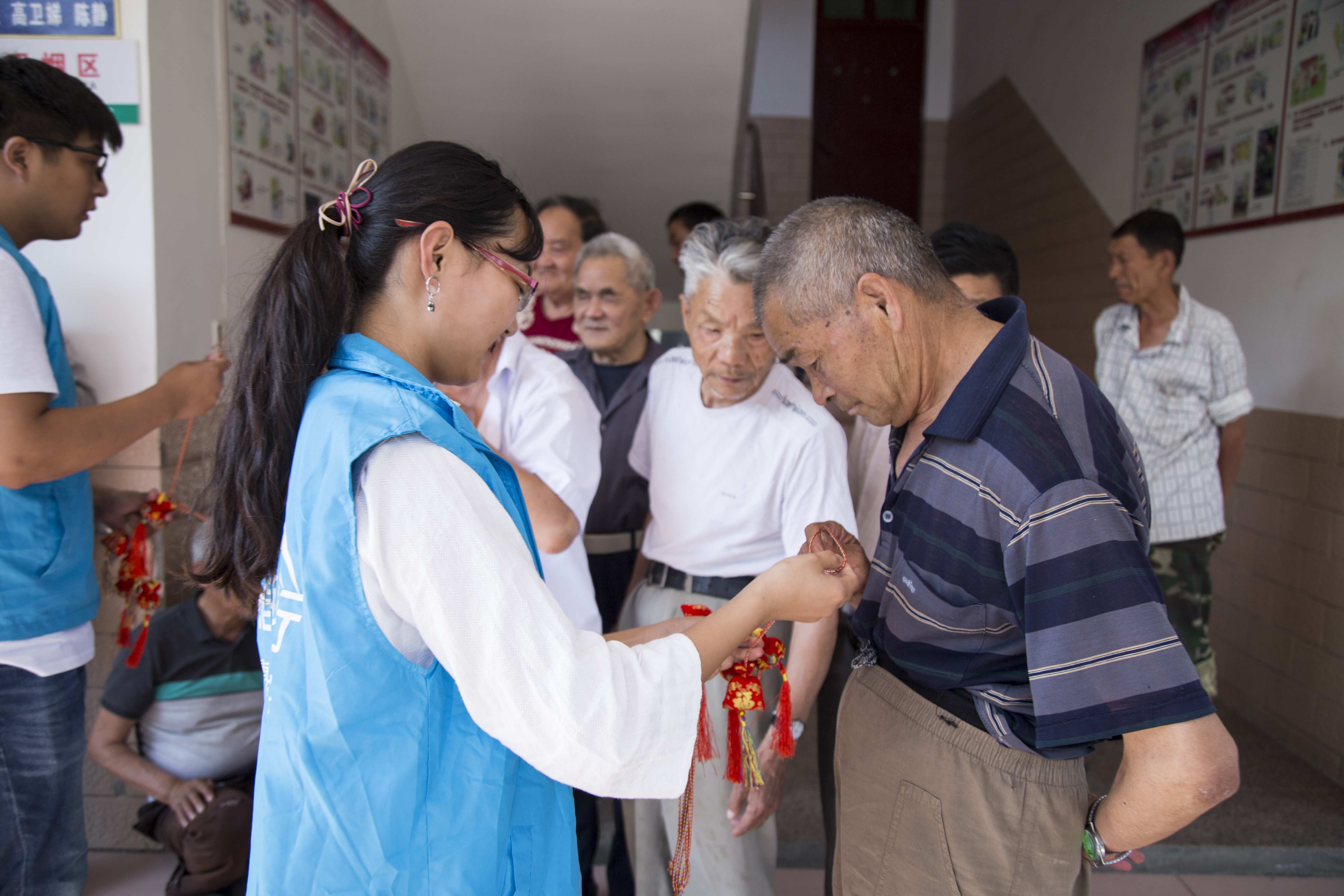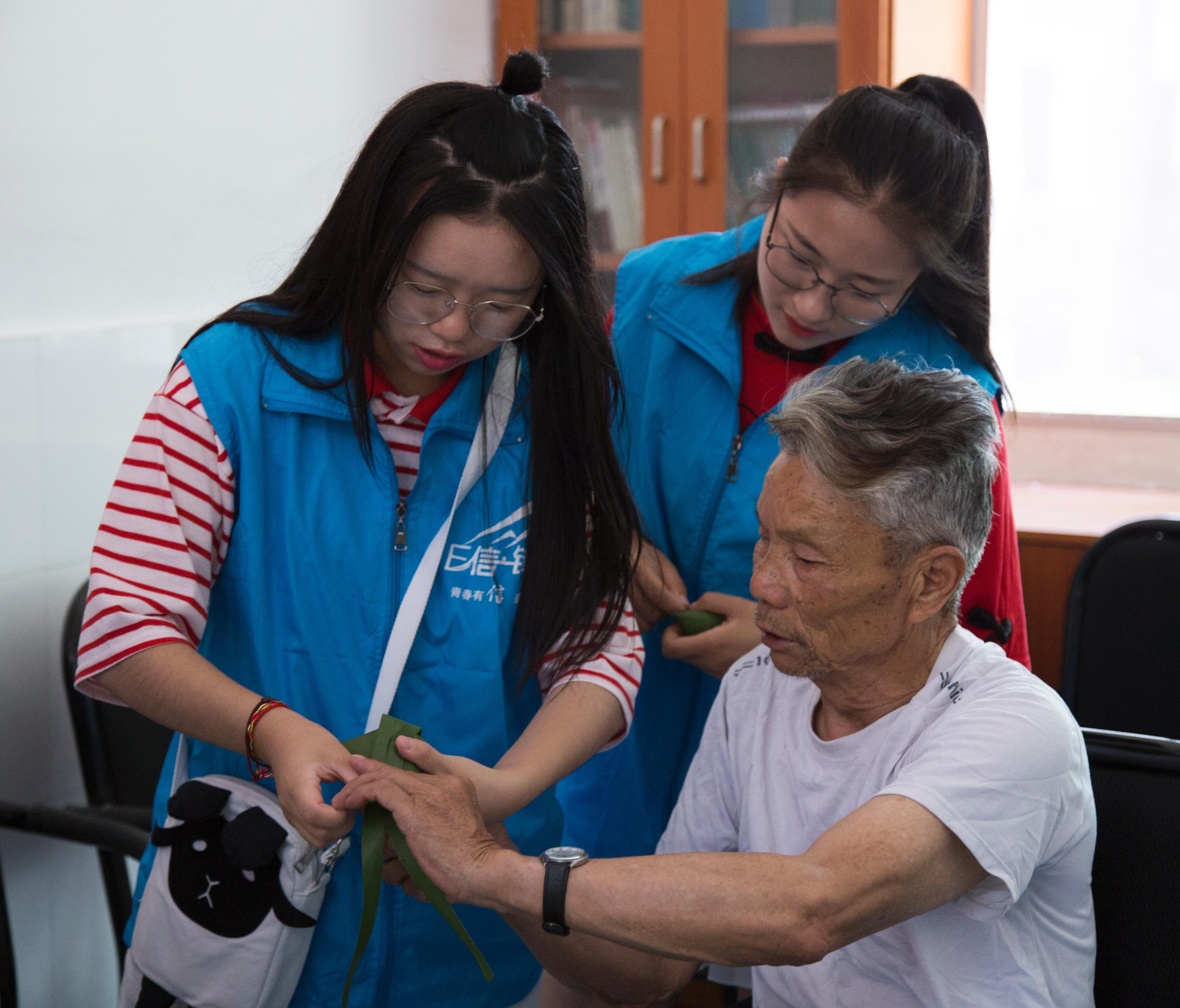 活动中,志愿者们一边听爷爷奶奶讲端午的传统故事和习俗,一边在他们的指导下包各种样式的粽子,大方粽、小脚粽、迷你粽……粽叶在老人们的手里不停的飞舞,一会儿工夫,就包好了一筐。在蒸煮粽子的间隙,志愿者们为老人佩戴上精心准备的中药香囊,帮助老人们去暑防蚊,老人们也为志愿者系上五彩绒线,寓意健康成长。带着香囊,系着绒线,大学生志愿者和老人们围坐在一起,志愿者随性一曲《女驸马》,老人们打着节拍哼唱着,现场气氛温馨从容。