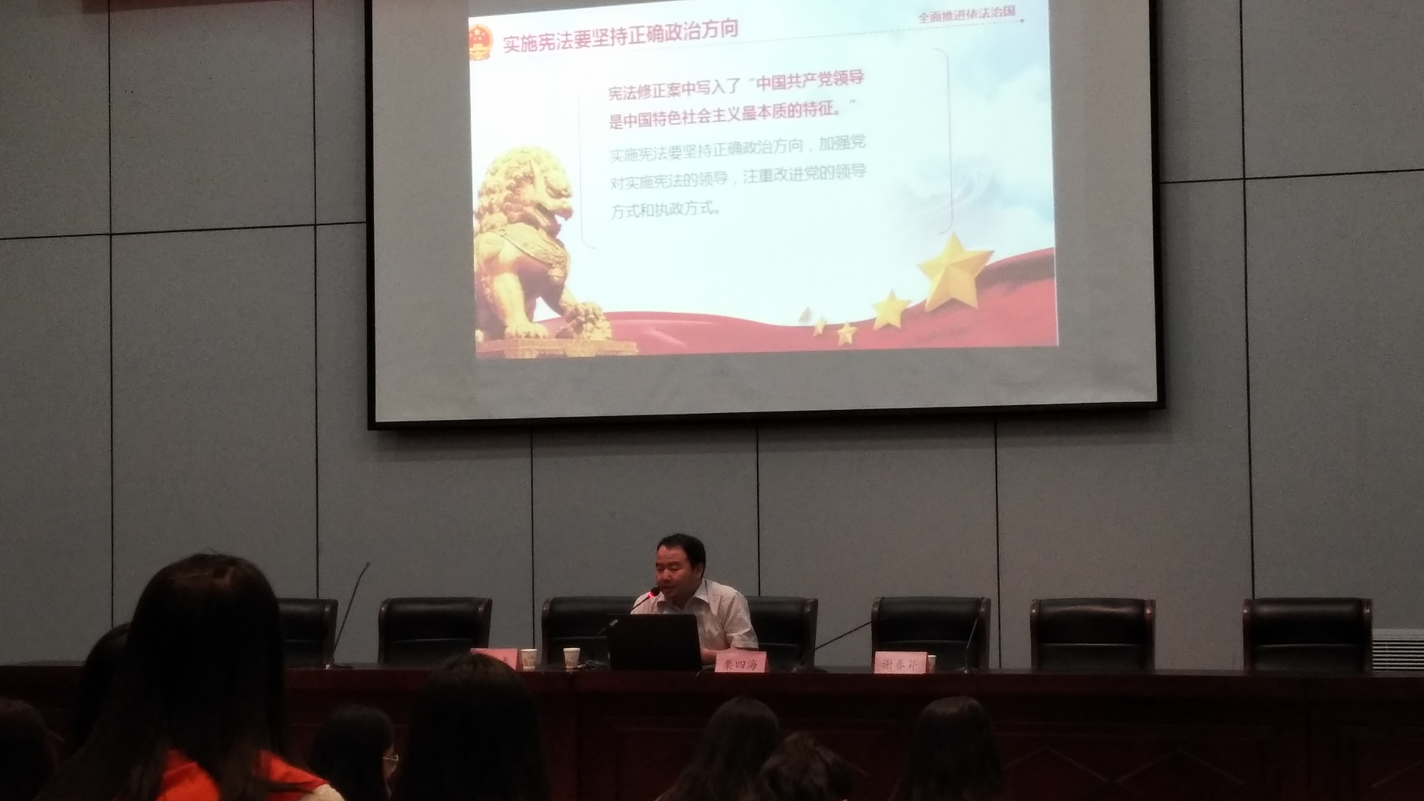 报告会以“学习宪法、遵守宪法、维护宪法、运用宪法”为题,围绕宪法的生命在于实施、实施宪法要坚持正确政治方向、对宪法实施进行严格监督、让宪法走进人民群众心里、用宪法维护好人民权益、在青少年中弘扬宪法精神等六个方面展开报告。详细阐述了宪法是什么样的法律、依法治国的基本原则、宪法应该发挥的作用;详细说明了宪法的基本原则和宪法在日常生活中的具体体现,分析了人们对宪法缺乏热情的原因,并提出要注意反思问题的根本。并建议同学们会后能够认真体会,多加思考,努力提高个人的法律修养,做一名知法、懂法、守法的合格公民,从而为推进我国法制化进程做出贡献。