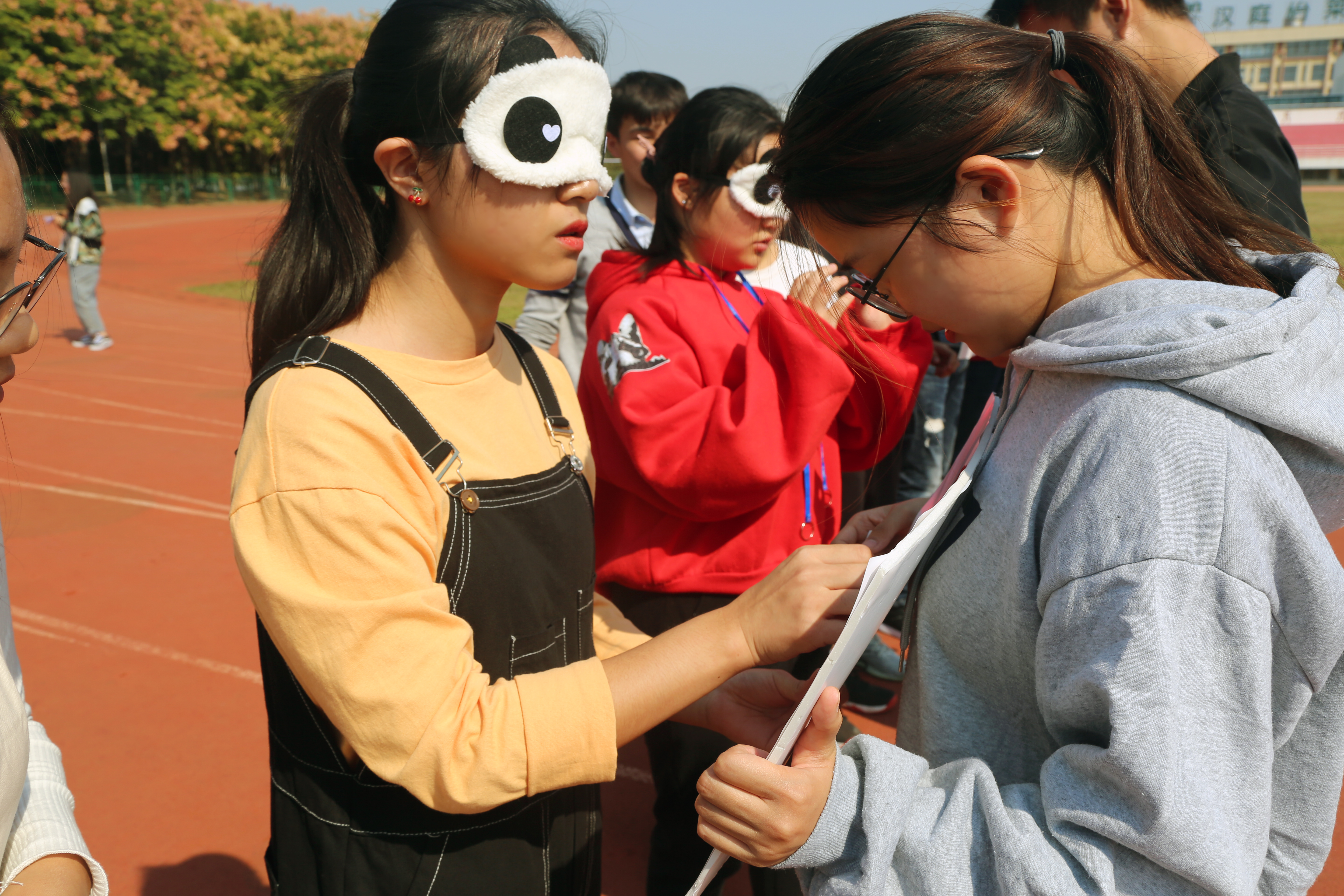 活动中,主持人向同学们介绍了国际盲人日的由来并呼吁同学们要注重用眼卫生,接着讲解了本次盲人体验的游戏规则,即两人一组,其中一位同学扮演“盲人”,另一位同学则要帮助“盲人”完成所有挑战。通过合作完成假如失去光明、贴鼻子、盲人倒水、盲人摸象、争为指路人五个环节,扮演“盲人”的同学们在亲身体验到了失去光明后更加理解盲人们所处的黑暗世界,纷纷表示今后将关爱盲人生活、倾听盲人世界,尽自己所能去帮助有需要的人,共建和谐、文明社会。