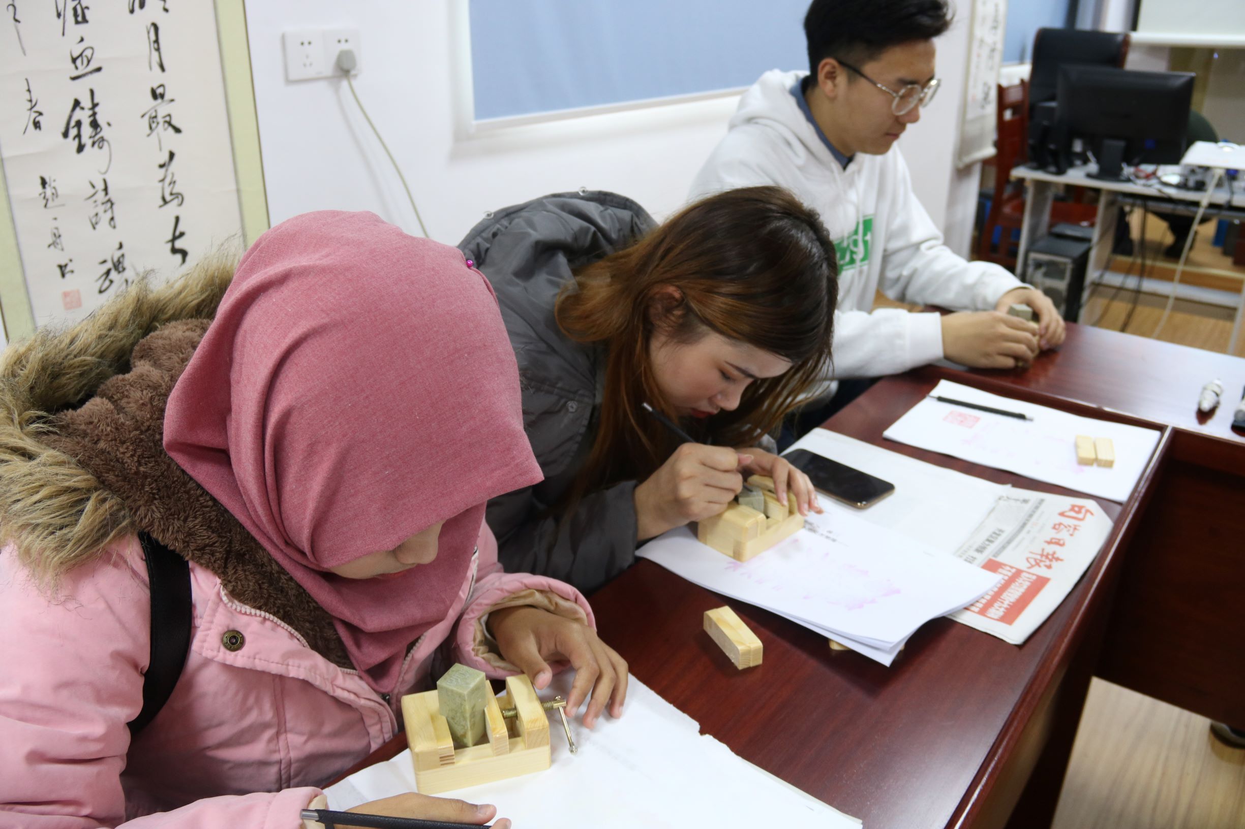 “笔尖辉煌四十载”活动中,书法家张远桃老先生展示了多年来的书法作品,在浓厚的书法气息中感受文化。“妙笔丹青”环节中,老艺术家与同学们现场挥毫,互赠中国画与毛笔字作品。“金石华彩”环节中,由篆刻艺术家带领同学们领略篆刻的魅力。永利官网来自印度尼西亚和老挝的留学生代表和学生代表学习过篆刻的技巧后,纷纷动手实践,篆刻出了独属自己的印章。