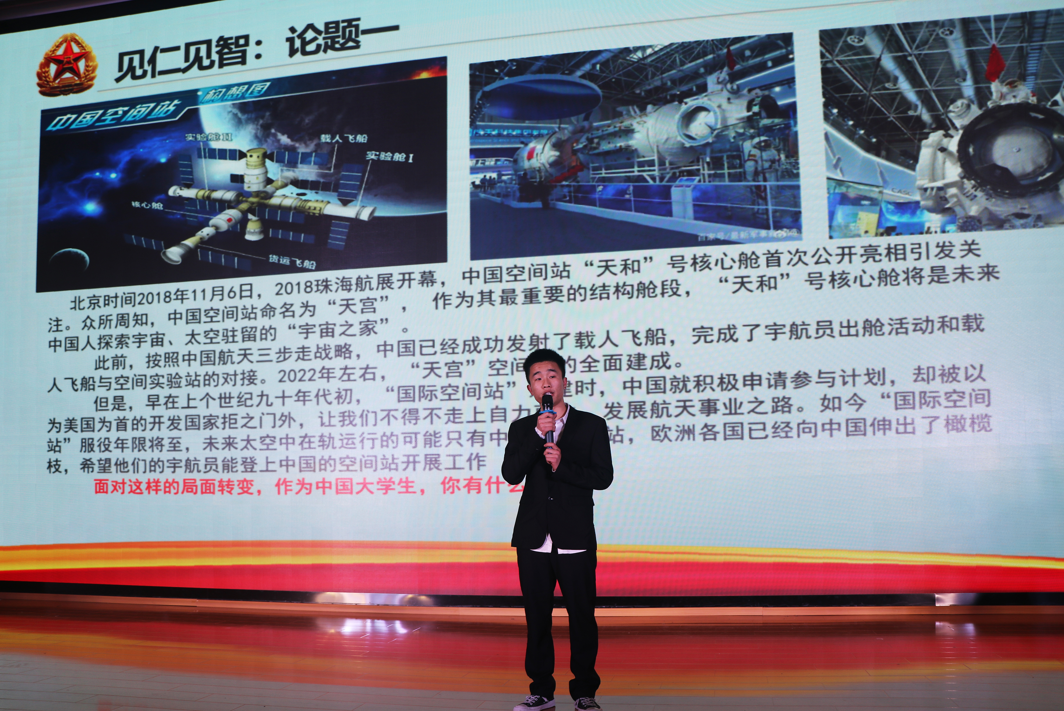 本次竞赛由“知己知彼”答题环节、“军歌嘹亮”演唱环节和“见仁见智”时评环节组成,共有各二级学院和茅山校区的退伍复学学生为队长组成的八支参赛队。竞赛过程中,选手们答题沉稳自信,演唱铿锵有力,演讲慷慨激昂,展现了当代大学生关心国防发展,无悔投身军营的爱国热情。竞赛尾声,武警句容中队周海宸上尉点评了本次活动,他强调只有祖国繁荣昌盛才能换来我们如今的美好生活,他也祝愿我们以后的国防素质竞赛活动会越办越好。