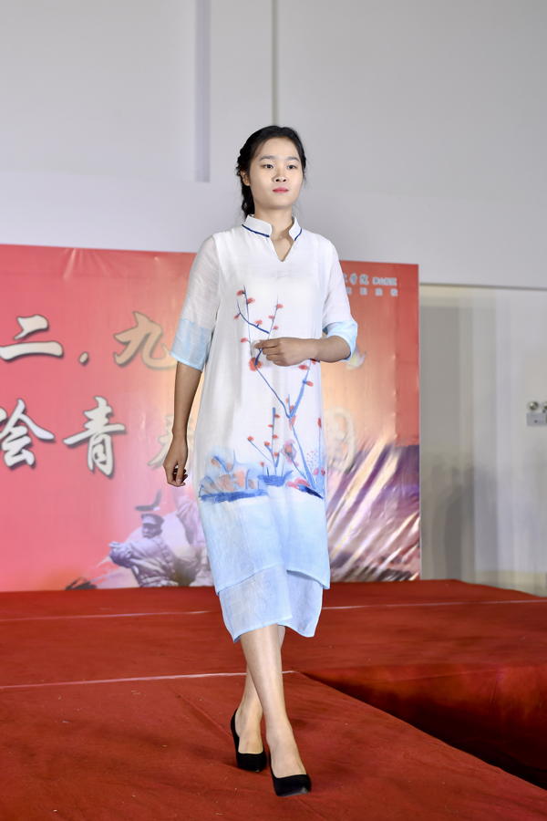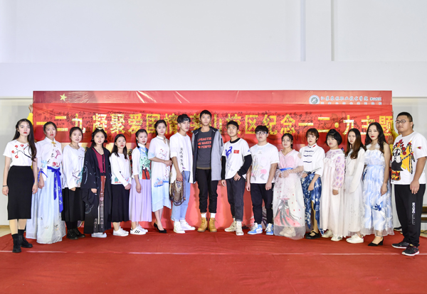 本次大赛以“爱国”“民族”“传统”“梦想”为主题,参赛选手以颜料彩粉手绘、传统扎染技艺或者旧衣物废弃等为原材料设计、制作成衣服,再由模特将作品展现于舞台上。有以京剧人物形象为主题,突出中国风的元素的《满堂花开三千醉》、有表现高洁自强不息精神的《花中君子》,有以黑色棉布为主,以敦煌神女飞天绘色图案为辅,代表着沉稳彰显希望的《子夜吴歌》,独特的设计,自由的造型,在绚丽的作品展示中,各设计师介绍了设计的主题和理念。现场,同学们还以三行诗朗诵、横幅签名的形式表达了自己的爱国热情。